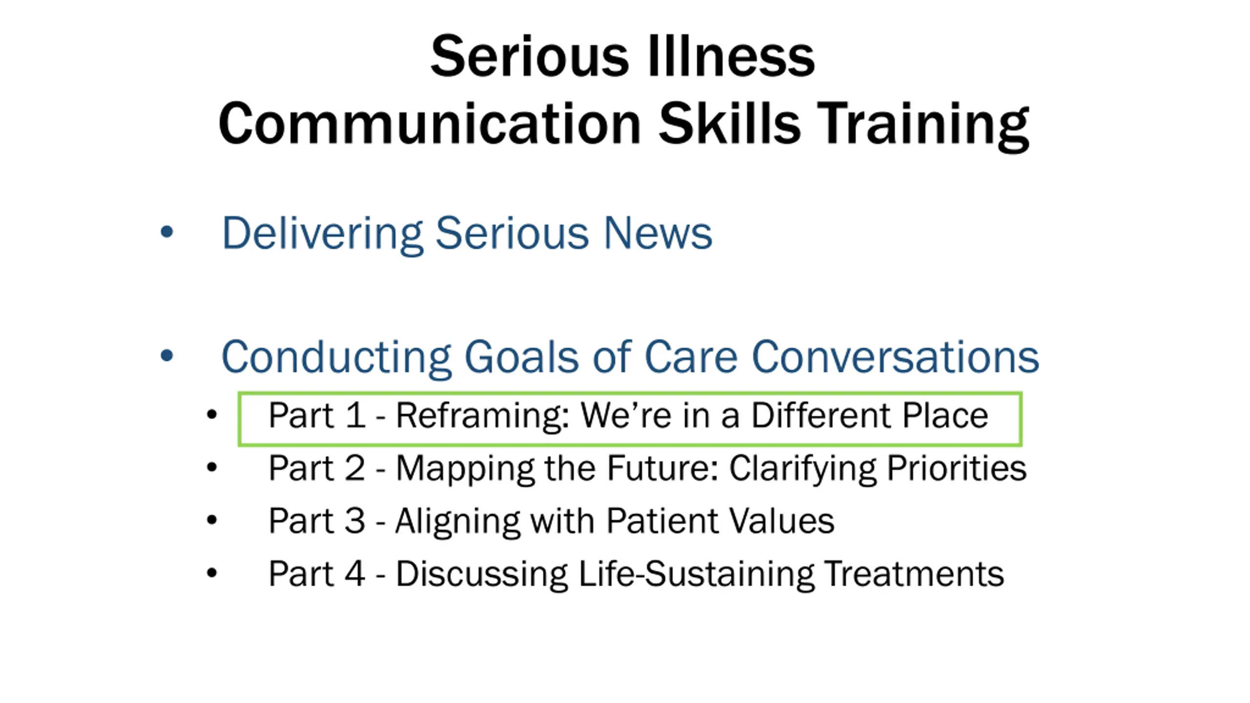 Serious Illness Communication Skills Training Delivering Serious News Conducting Goals of Care Conversations Part 1 - Reframing: We re in a Different Place Part 2 - Mapping the Future: Clarifying Priorities Part 3 - Aligning with Patient Values Part 4 - Discussing Life-Sustaining Treatments
