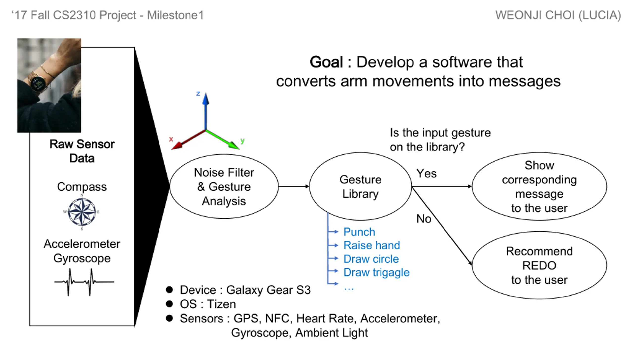 "WEONJI CHOI (LUCIA) aims to develop software converting arm movements into messages using sensors like accelerometer and gyroscope on Galaxy Gear S3 with Tizen OS. Milestones include sensor testing and gesture analysis for user interface design."