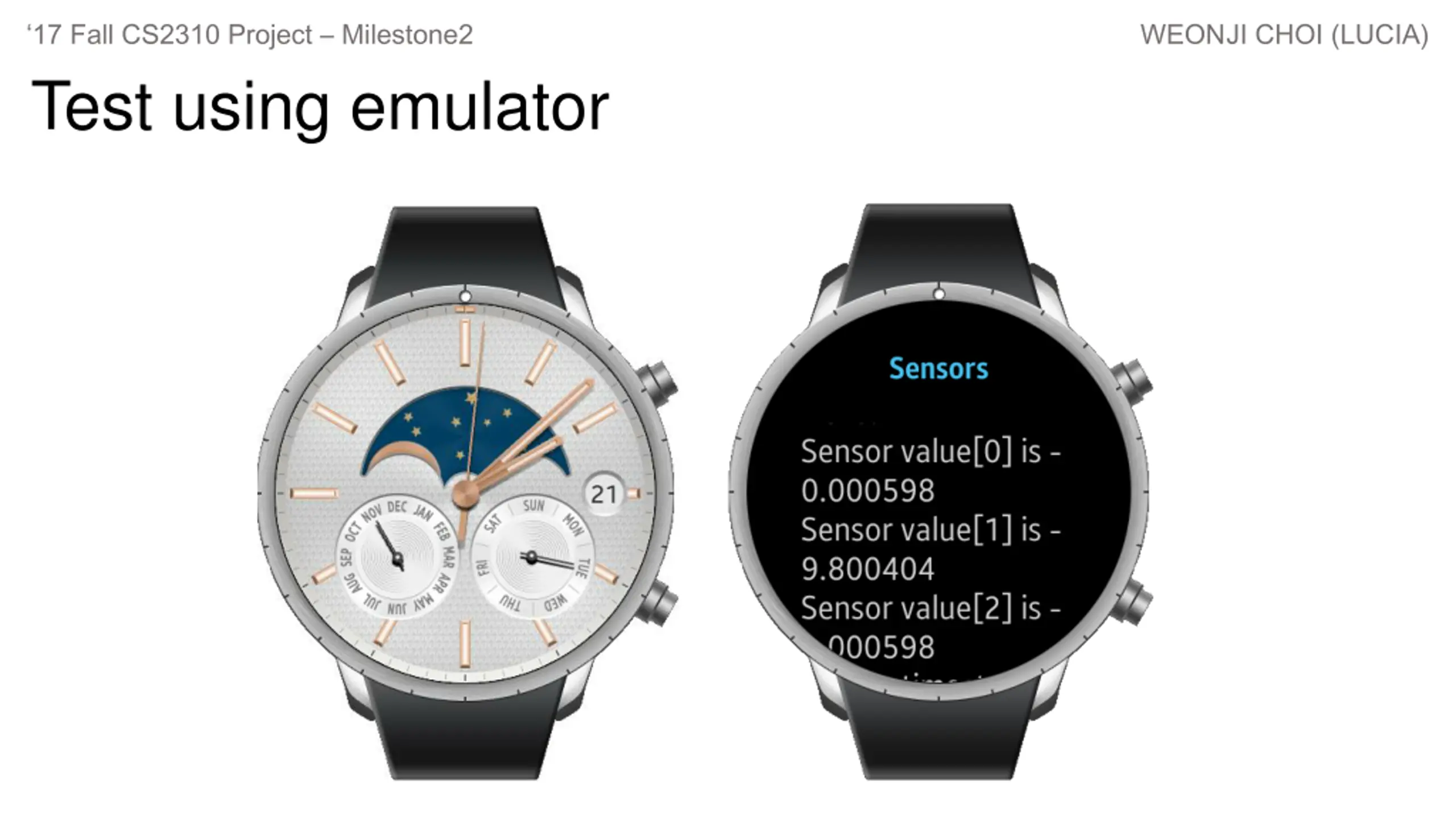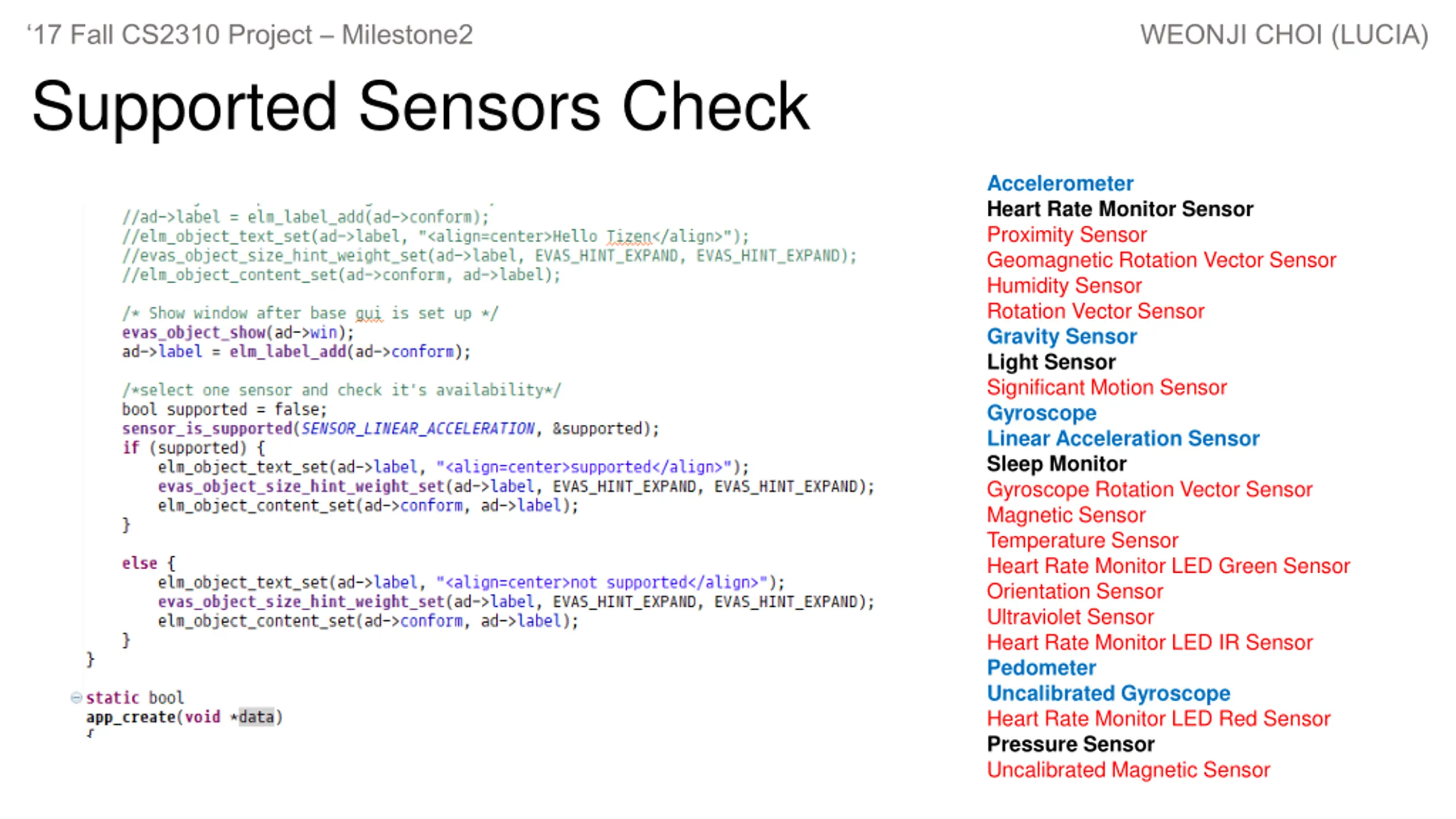 17 Fall CS2310 Project Milestone2 WEONJI CHOI (LUCIA) Supported Sensors Check Accelerometer Heart Rate Monitor Sensor Proximity Sensor Geomagnetic Rotation Vector Sensor Humidity Sensor Rotation Vector Sensor Gravity Sensor Light Sensor Significant Motion Sensor Gyroscope Linear Acceleration Sensor Sleep Monitor Gyroscope Rotation Vector Sensor Magnetic Sensor Temperature Sensor Heart Rate Monitor LED Green Sensor Orientation Sensor Ultraviolet Sensor Heart Rate Monitor LED IR Sensor Pedometer Uncalibrated Gyroscope Heart Rate Monitor LED Red Sensor Pressure Sensor Uncalibrated Magnetic Sensor