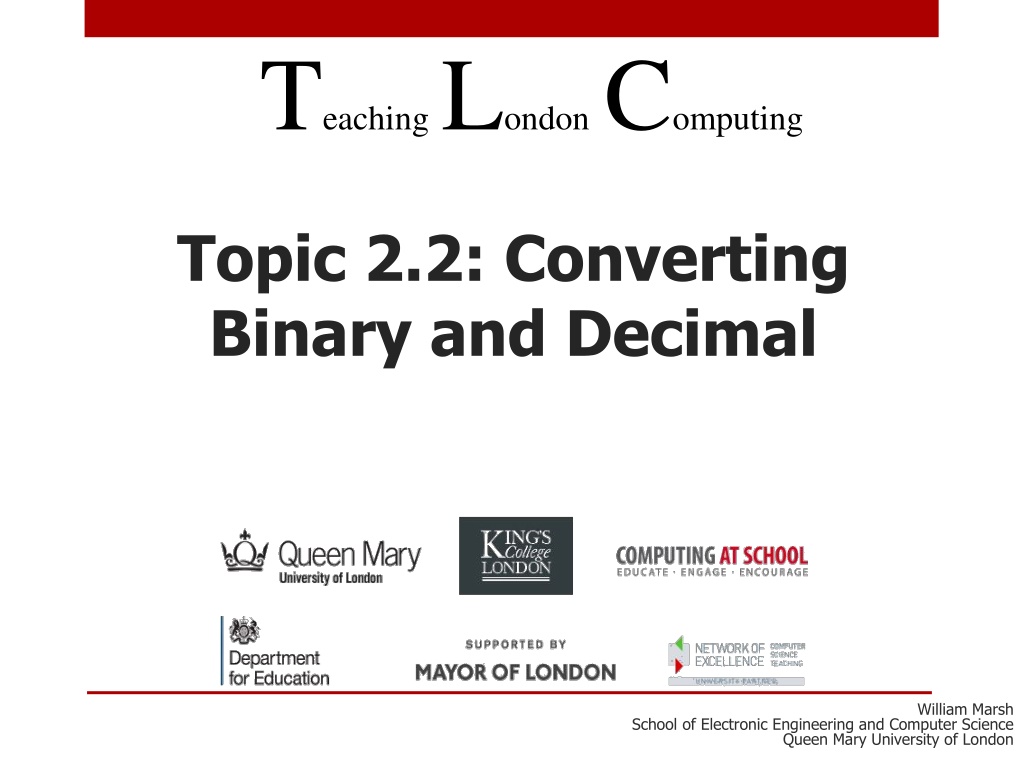 TeachingLondon Computing Topic 2.2: Converting Binary and Decimal William Marsh School of Electronic Engineering and Computer Science Queen Mary University of London