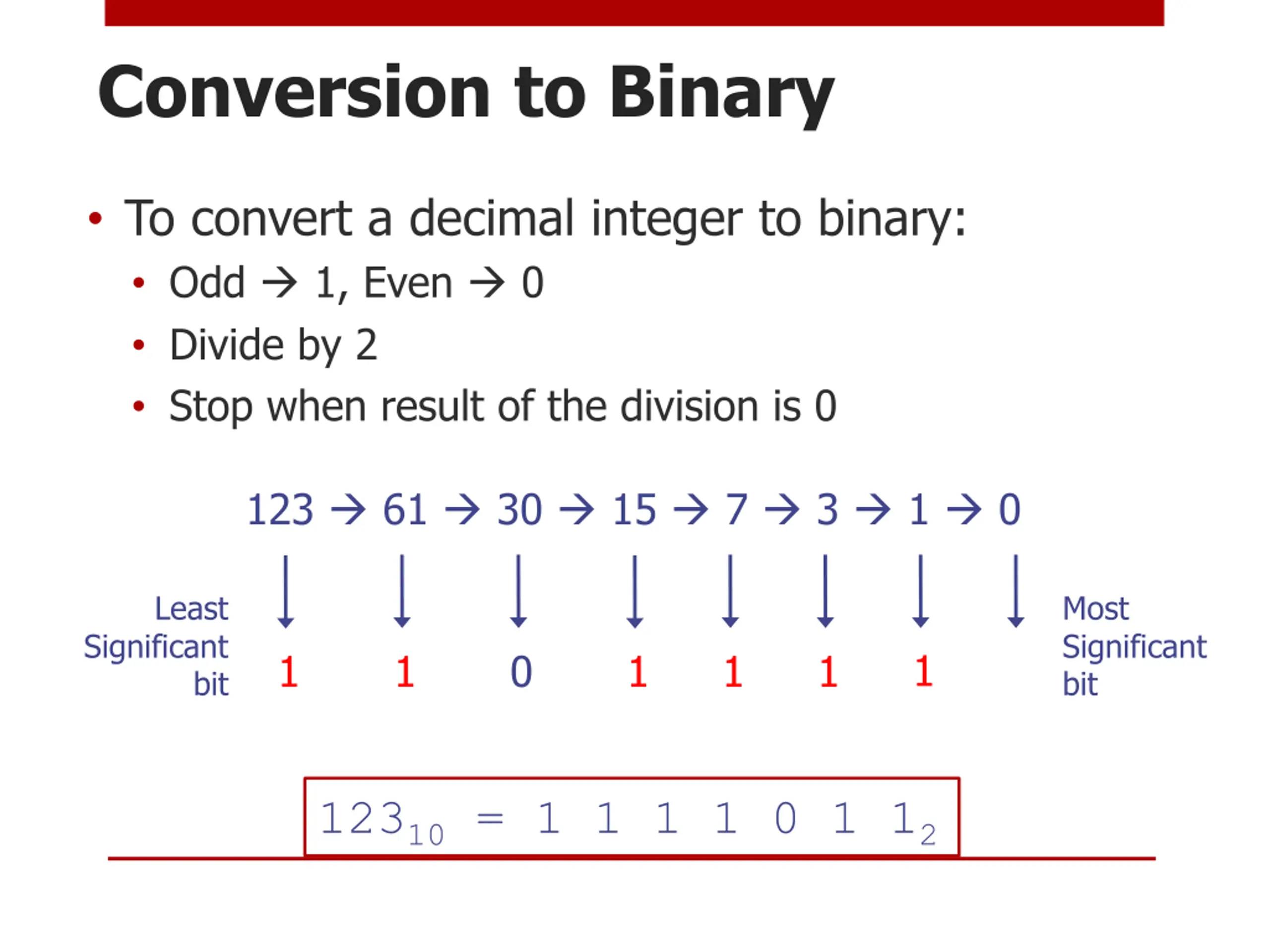 Conversion to Binary To convert a decimal integer to binary: Odd 1, Even 0 Divide by 2 Stop when result of the division is 0 123 61 30 15 7 3 1 0 Least Most Significant bit Significant 1 1 1 0 1 1 1 bit 12310 = 1 1 1 1 0 1 12