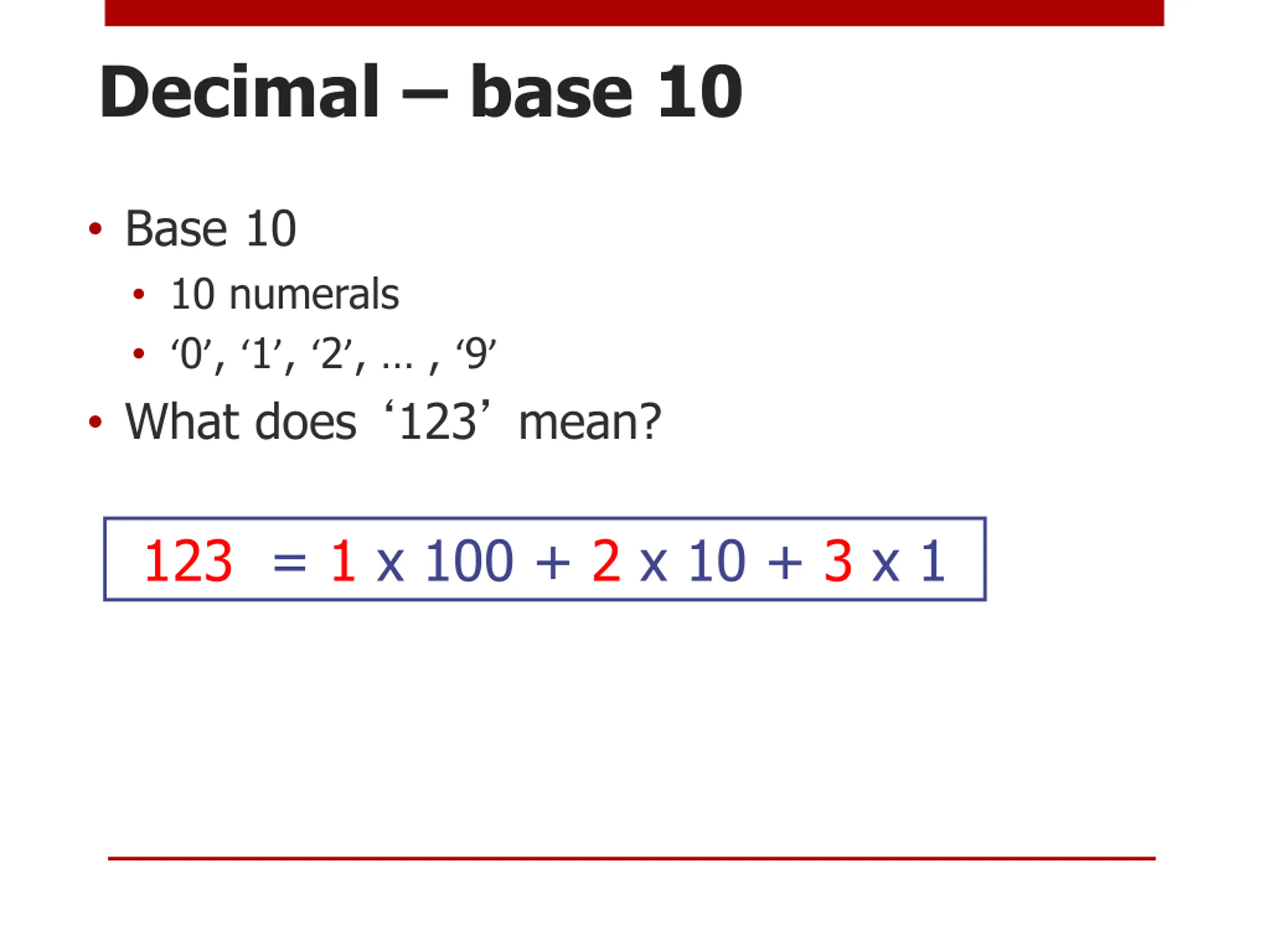 Decimal base 10 Base 10 10 numerals 0 , 1 , 2 , , 9 What does 123 mean? 123 = 1 x 100 + 2 x 10 + 3 x 1