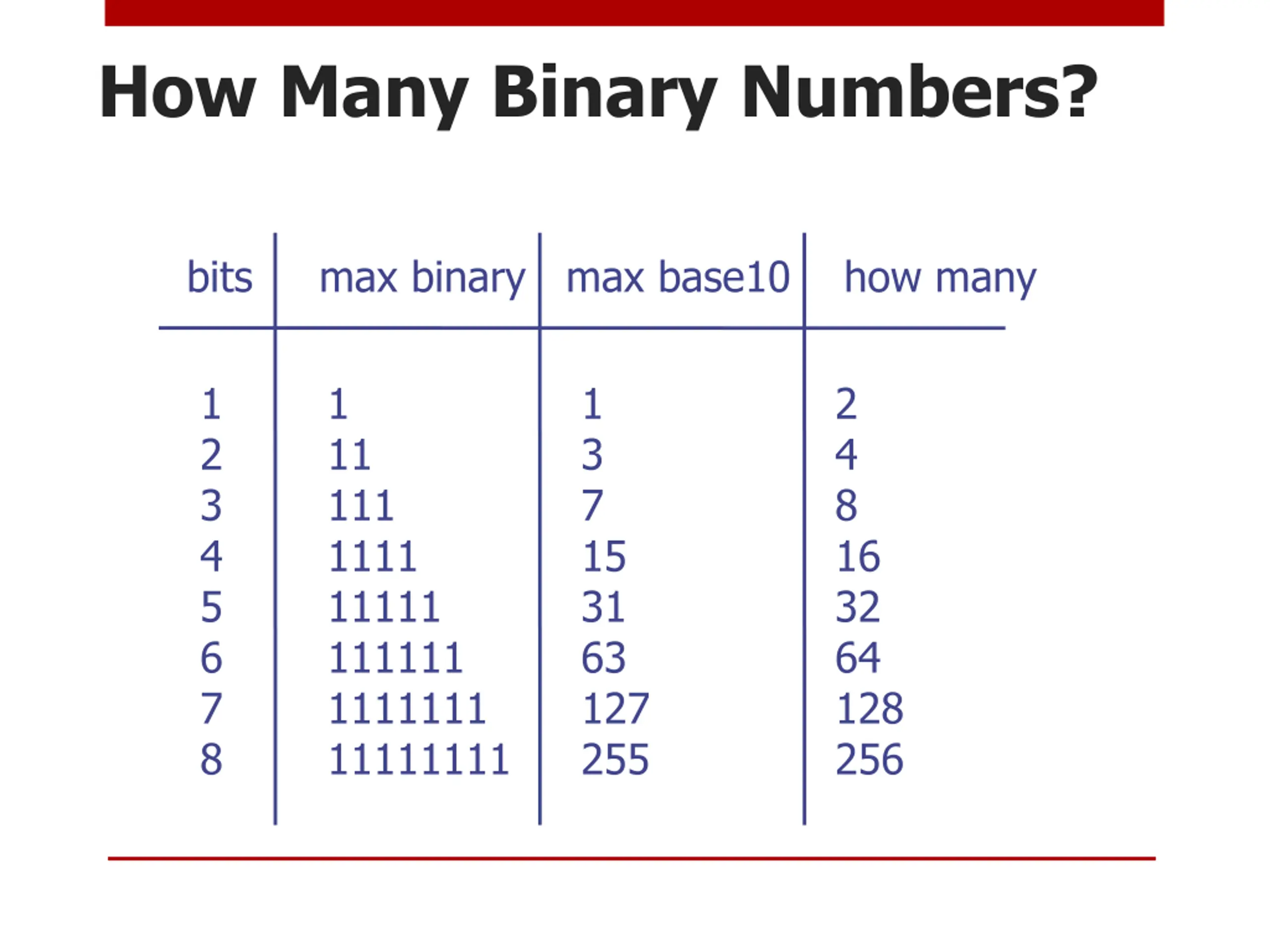 How Many Binary Numbers? bits max binary max base10 how many 1 2 3 4 5 6 7 8 1 11 111 1111 11111 111111 1111111 11111111 1 3 7 15 31 63 127 255 2 4 8 16 32 64 128 256