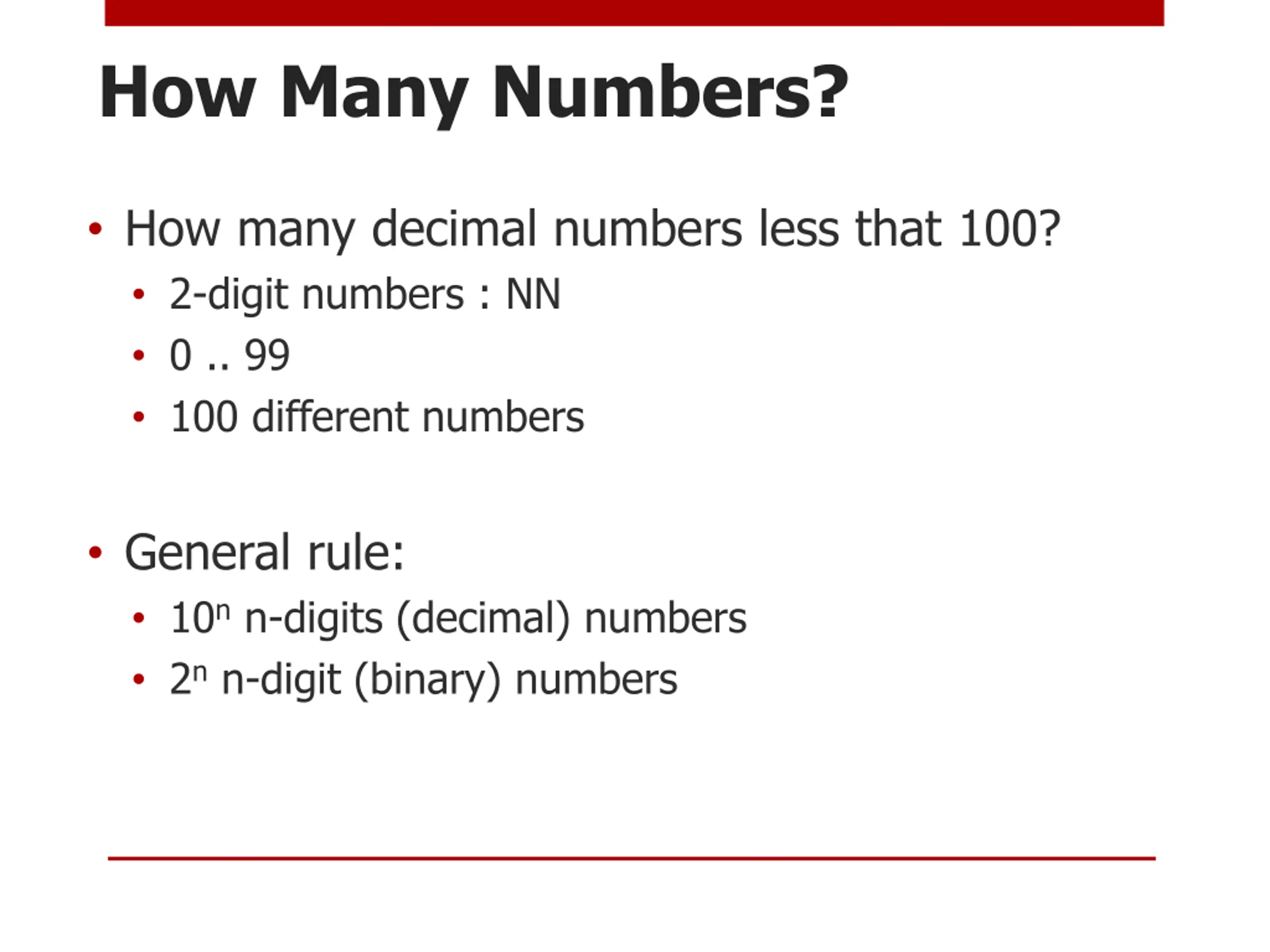 How Many Numbers? How many decimal numbers less that 100? 2-digit numbers : NN 0 .. 99 100 different numbers General rule: 10n n-digits (decimal) numbers 2n n-digit (binary) numbers