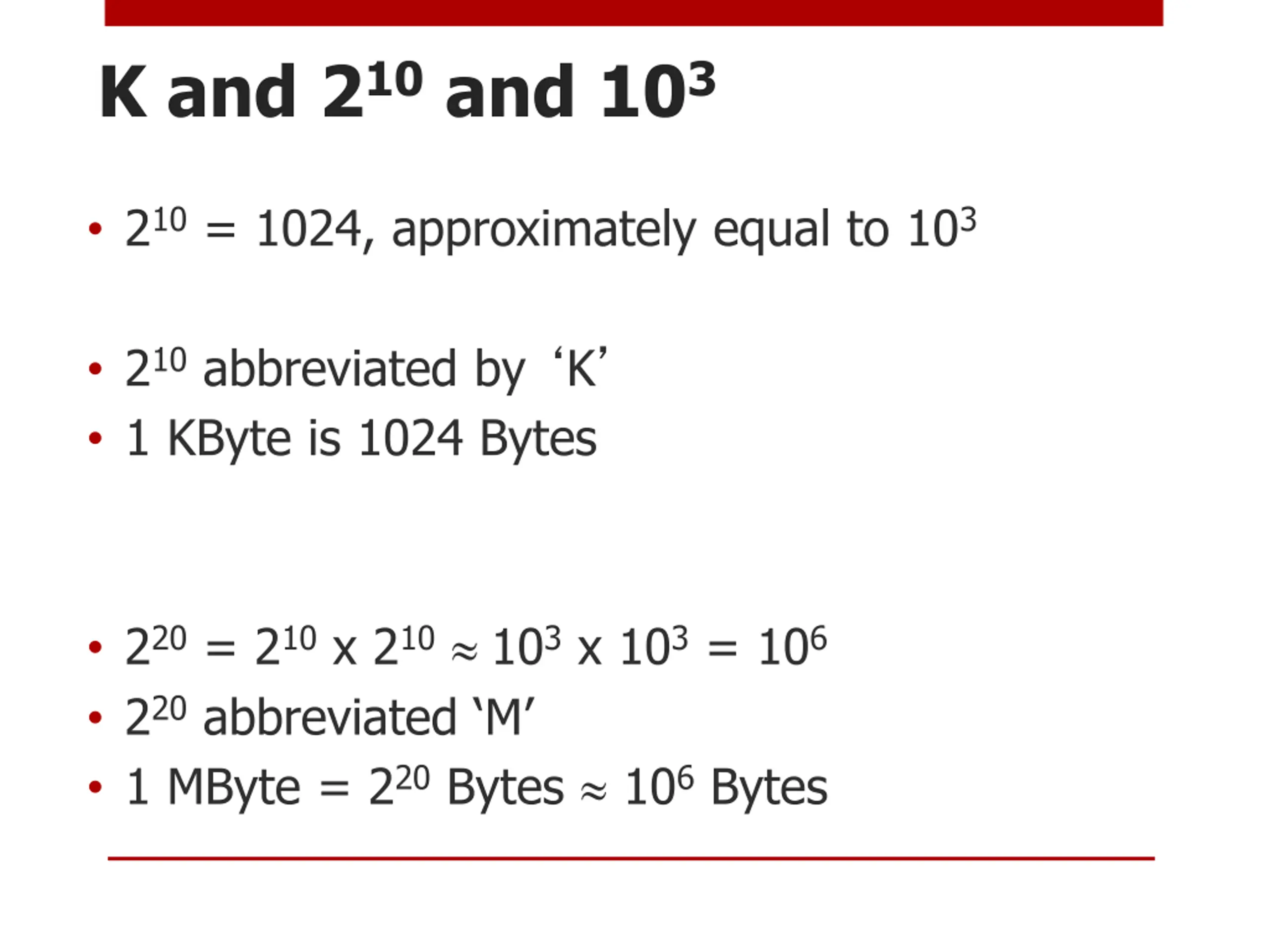 K and 210 and 103 210 = 1024, approximately equal to 103 210 abbreviated by K 1 KByte is 1024 Bytes 220 = 210 x 210 103 x 103 = 106 220abbreviated M 1 MByte = 220 Bytes 106 Bytes