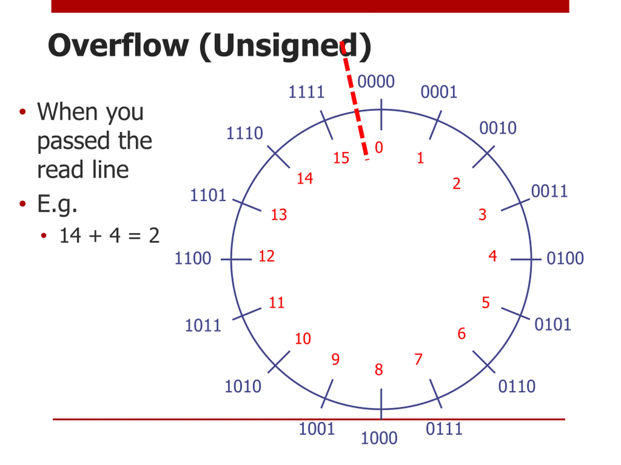 Overflow (Unsigned) 0000 1111 0001 When you passed the read line E.g. 14 + 4 = 2 0010 1110 0 15 1 14 2 0011 1101 13 3 12 4 1100 0100 11 5 0101 1011 6 10 9 7 8 1010 0110 1001 0111 1000
