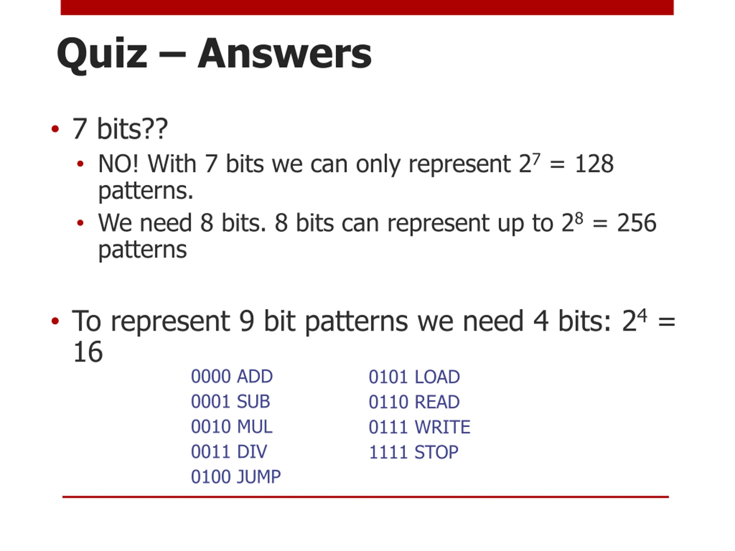 Quiz Answers 7 bits?? NO! With 7 bits we can only represent 27 = 128 patterns. We need 8 bits. 8 bits can represent up to 28 = 256 patterns To represent 9 bit patterns we need 4 bits: 24 = 16 0000 ADD 0001 SUB 0010 MUL 0011 DIV 0100 JUMP 0101 LOAD 0110 READ 0111 WRITE 1111 STOP
