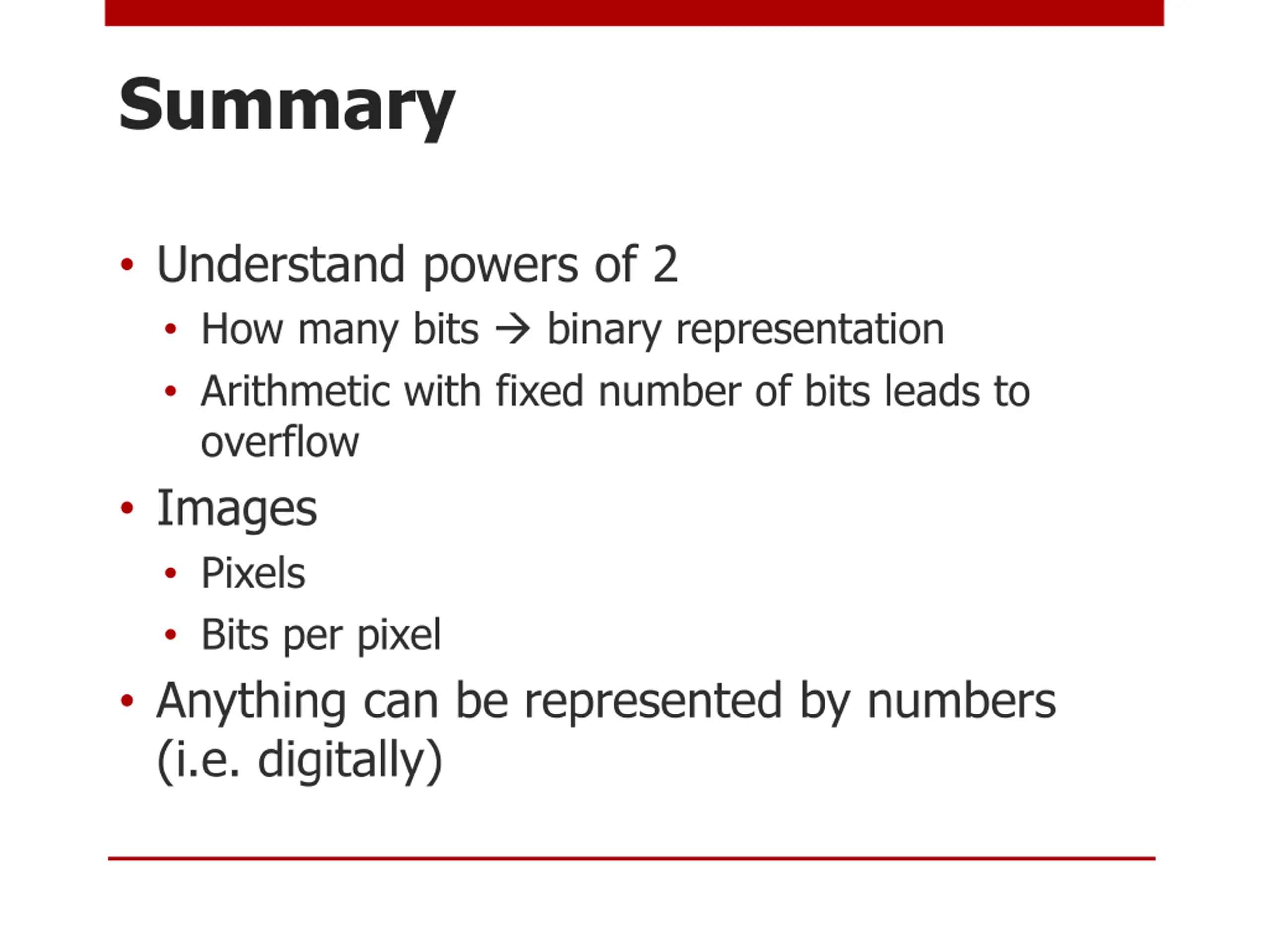 Summary Understand powers of 2 How many bits binary representation Arithmetic with fixed number of bits leads to overflow Images Pixels Bits per pixel Anything can be represented by numbers (i.e. digitally)