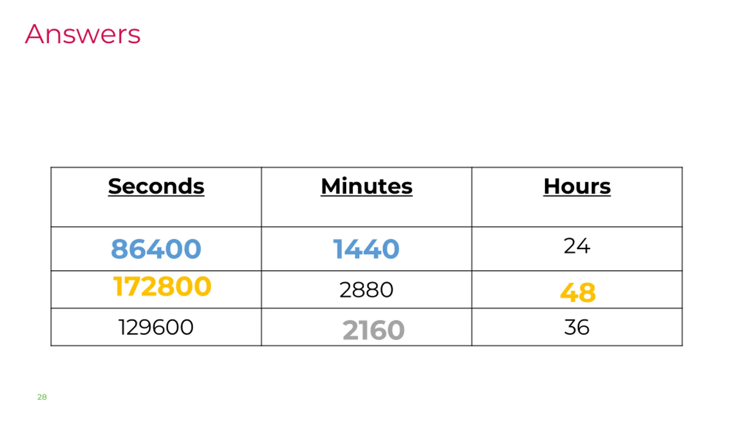 Answers Seconds Minutes Hours 86400 172800 1440 2880 2160 24 48 129600 36 28