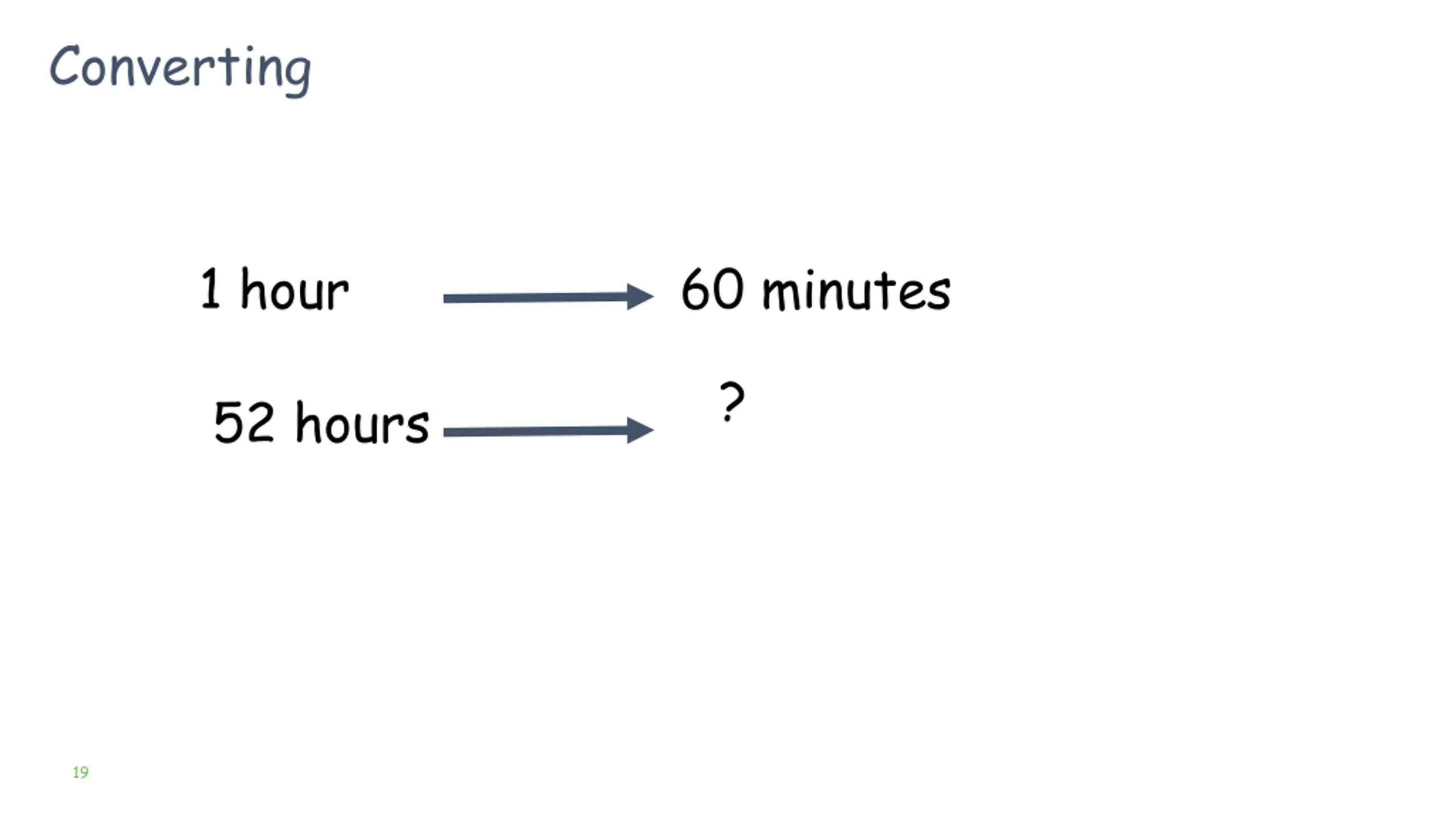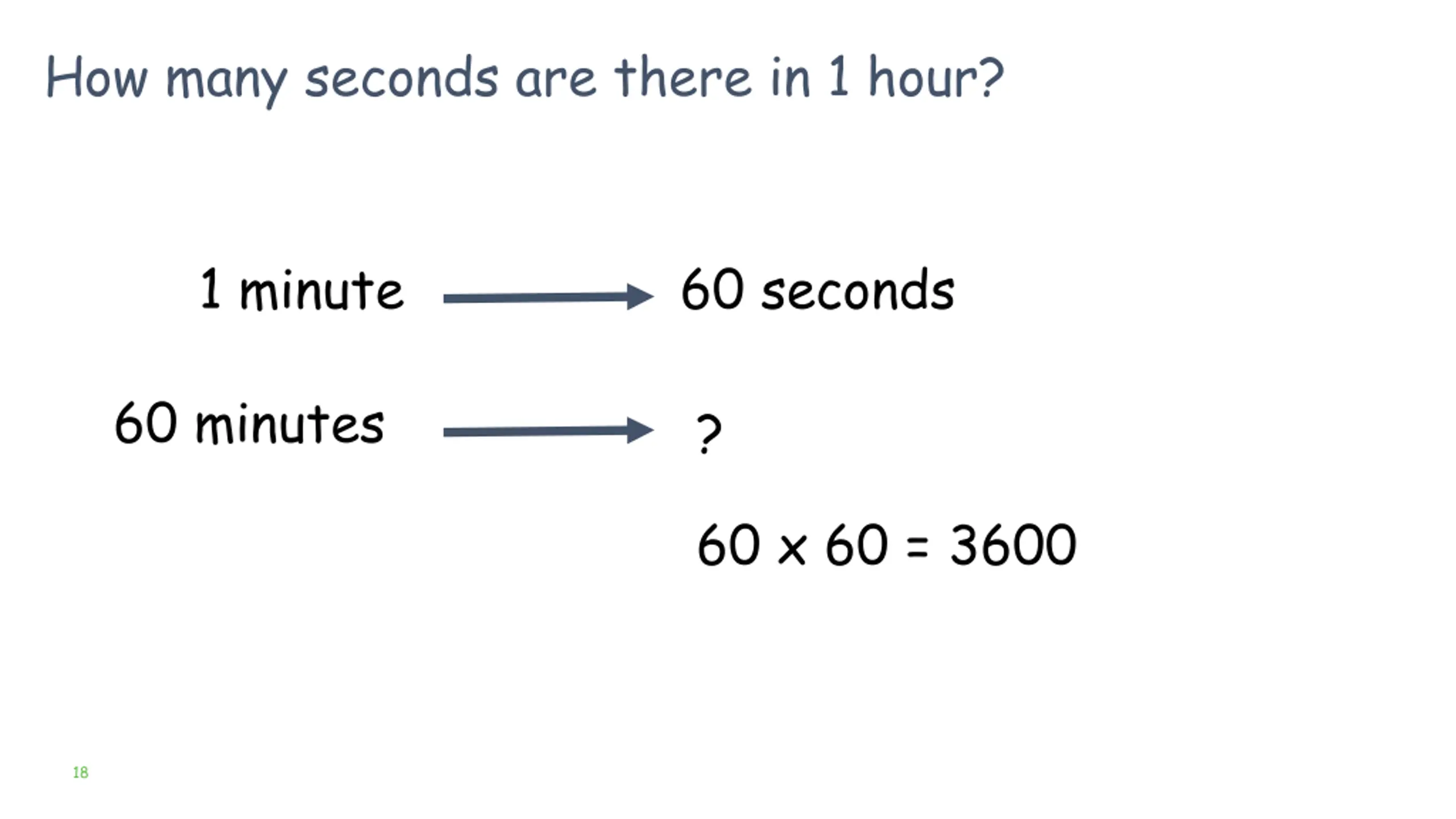 How many seconds are there in 1 hour? 1 minute 60 seconds 60 minutes ? 60 x 60 = 3600 18