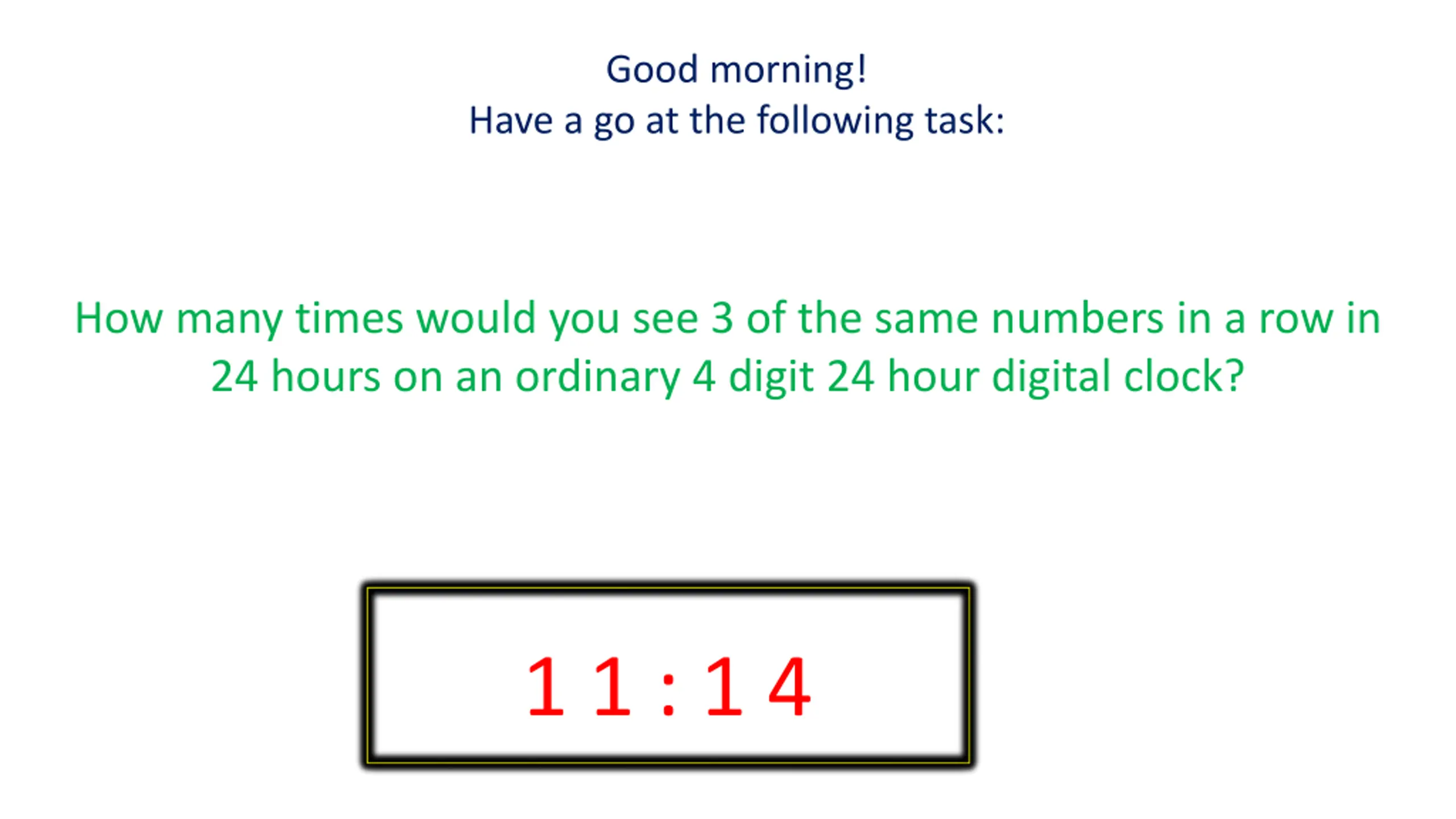 Good morning! Have a go at the following task: How many times would you see 3 of the same numbers in a row in 24 hours on an ordinary 4 digit 24 hour digital clock? 1 1 : 1 4