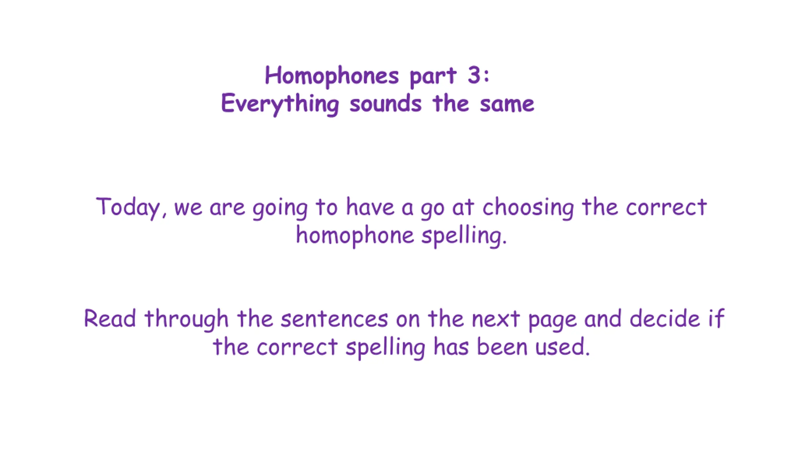 Homophones part 3: Everything sounds the same Today, we are going to have a go at choosing the correct homophone spelling. Read through the sentences on the next page and decide if the correct spelling has been used.