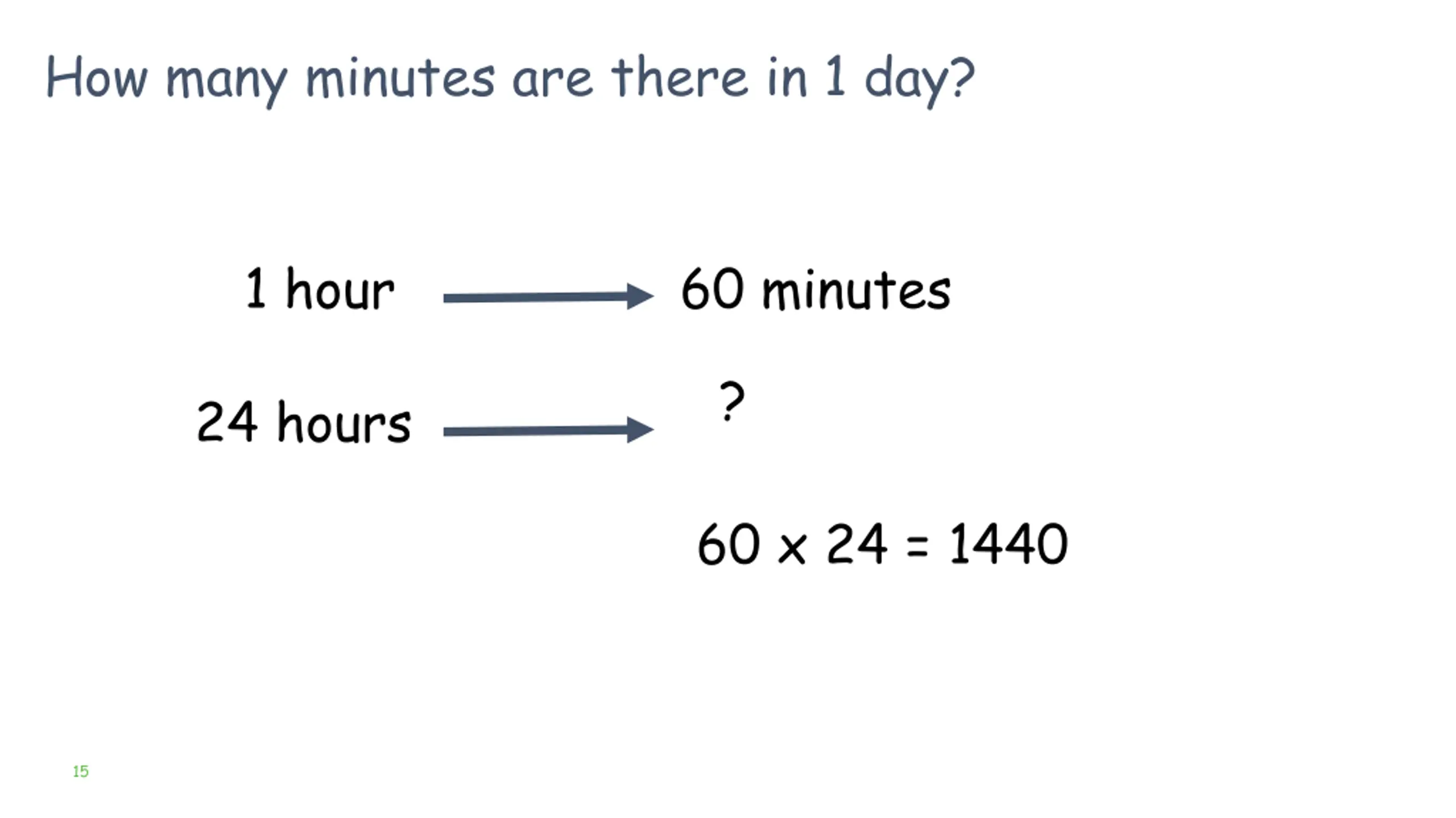 How many minutes are there in 1 day? 1 hour 60 minutes ? 24 hours 60 x 24 = 1440 15