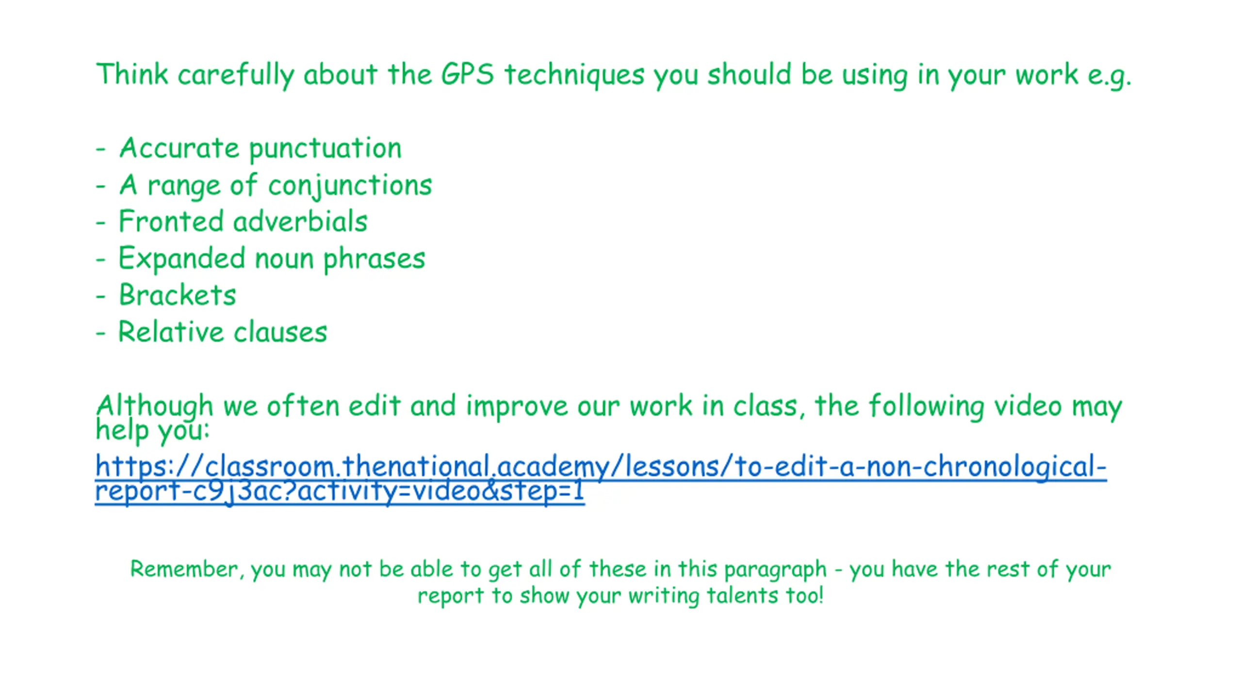 Think carefully about the GPS techniques you should be using in your work e.g. - Accurate punctuation - A range of conjunctions - Fronted adverbials - Expanded noun phrases - Brackets - Relative clauses Although we often edit and improve our work in class, the following video may help you: https://classroom.thenational.academy/lessons/to-edit-a-non-chronological- report-c9j3ac?activity=video&step=1 Remember, you may not be able to get all of these in this paragraph - you have the rest of your report to show your writing talents too!
