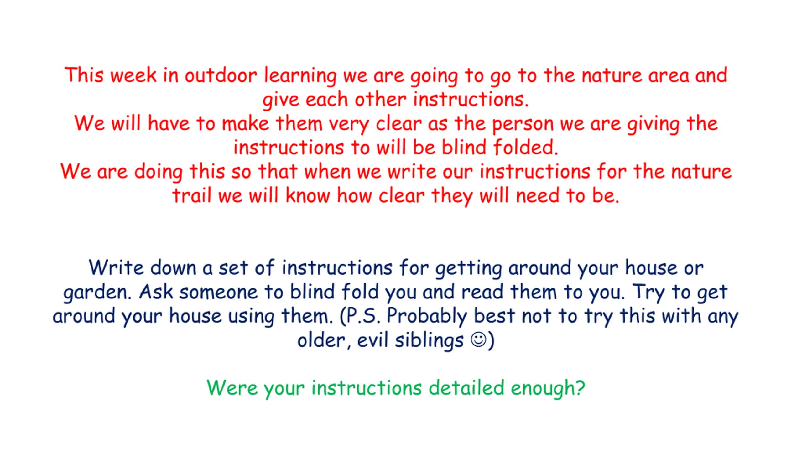 This week in outdoor learning we are going to go to the nature area and give each other instructions. We will have to make them very clear as the person we are giving the instructions to will be blind folded. We are doing this so that when we write our instructions for the nature trail we will know how clear they will need to be. Write down a set of instructions for getting around your house or garden. Ask someone to blind fold you and read them to you. Try to get around your house using them. (P.S. Probably best not to try this with any older, evil siblings ) Were your instructions detailed enough?