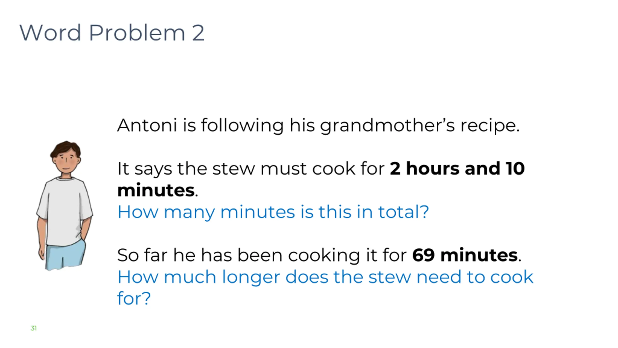 Word Problem 2 Antoni is following his grandmother s recipe. It says the stew must cook for 2 hours and 10 minutes. How many minutes is this in total? So far he has been cooking it for 69 minutes. How much longer does the stew need to cook for? 31