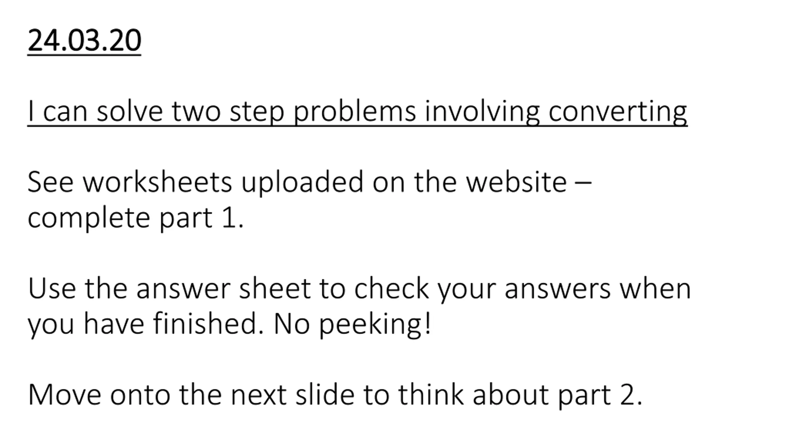 24.03.20 24.03.20 I can solve two step problems involving converting See worksheets uploaded on the website complete part 1. Use the answer sheet to check your answers when you have finished. No peeking! Move onto the next slide to think about part 2.