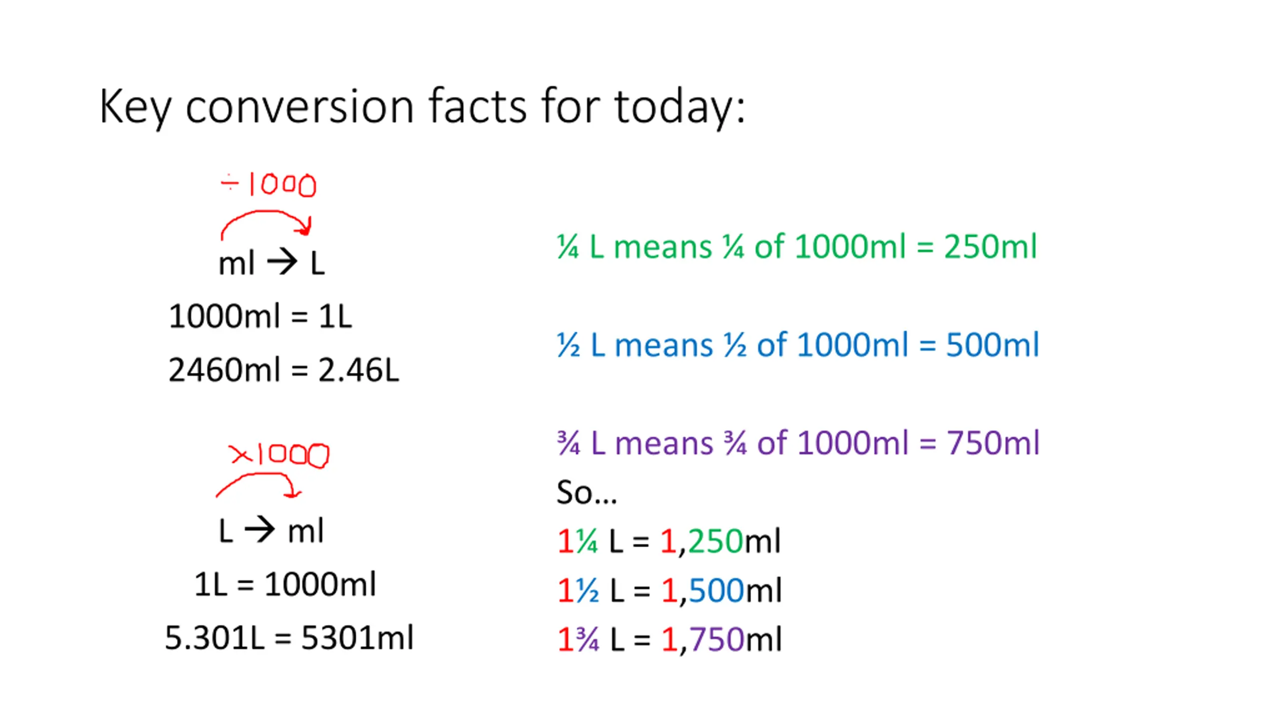 Key conversion facts for today: L means of 1000ml = 250ml ml L 1000ml = 1L 2460ml = 2.46L L means of 1000ml = 500ml L means of 1000ml = 750ml So 1 L = 1,250ml 1 L = 1,500ml 1 L = 1,750ml L ml 1L = 1000ml 5.301L = 5301ml