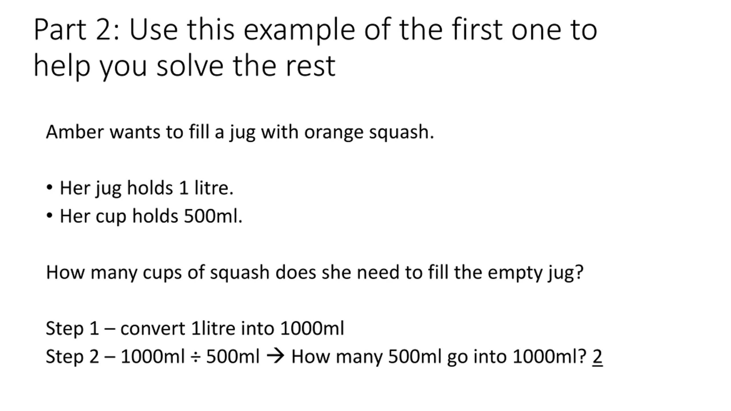 Part 2: Use this example of the first one to help you solve the rest Amber wants to fill a jug with orange squash. Her jug holds 1 litre. Her cup holds 500ml. How many cups of squash does she need to fill the empty jug? Step 1 convert 1litre into 1000ml Step 2 1000ml 500ml How many 500ml go into 1000ml? 2