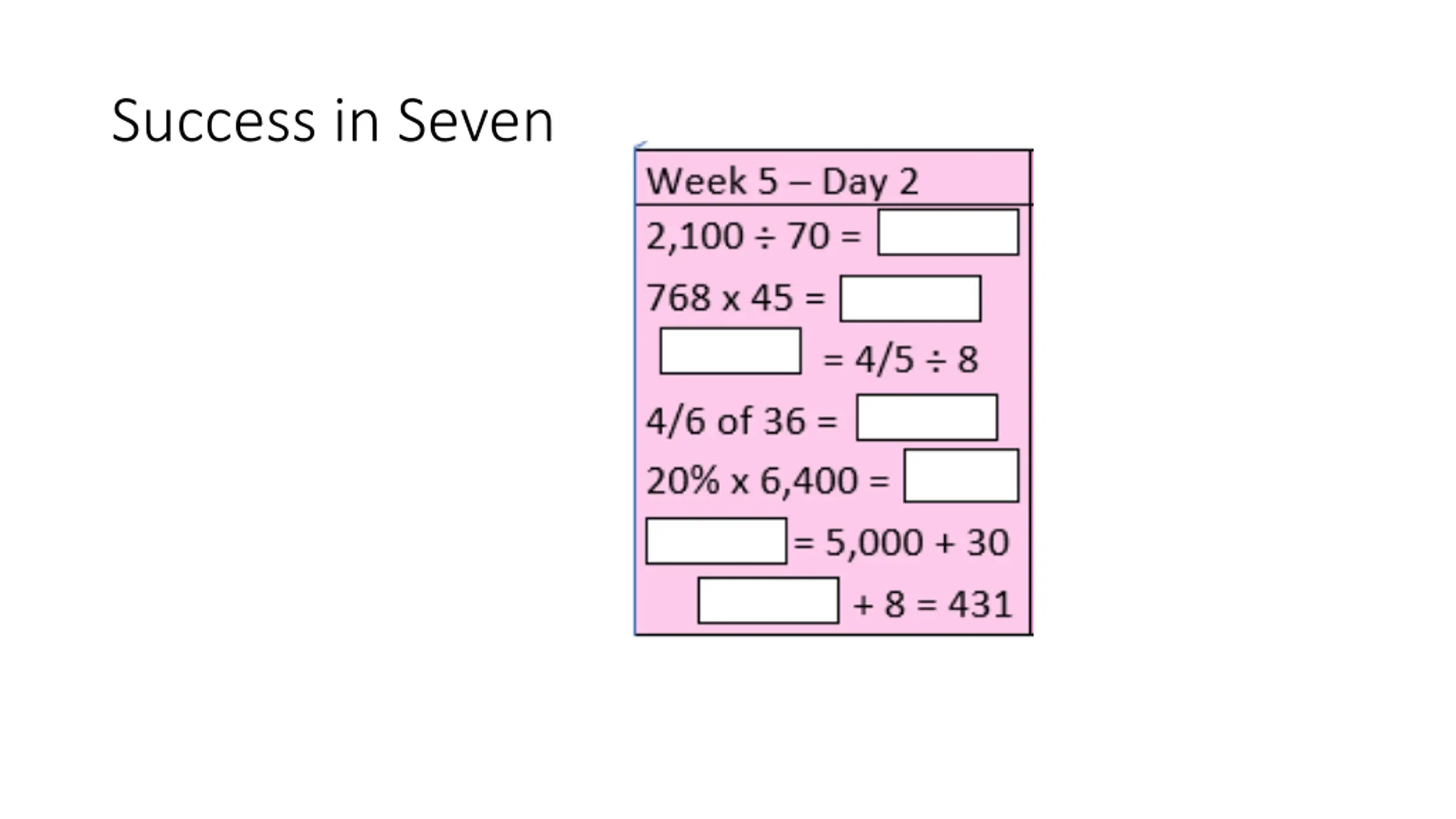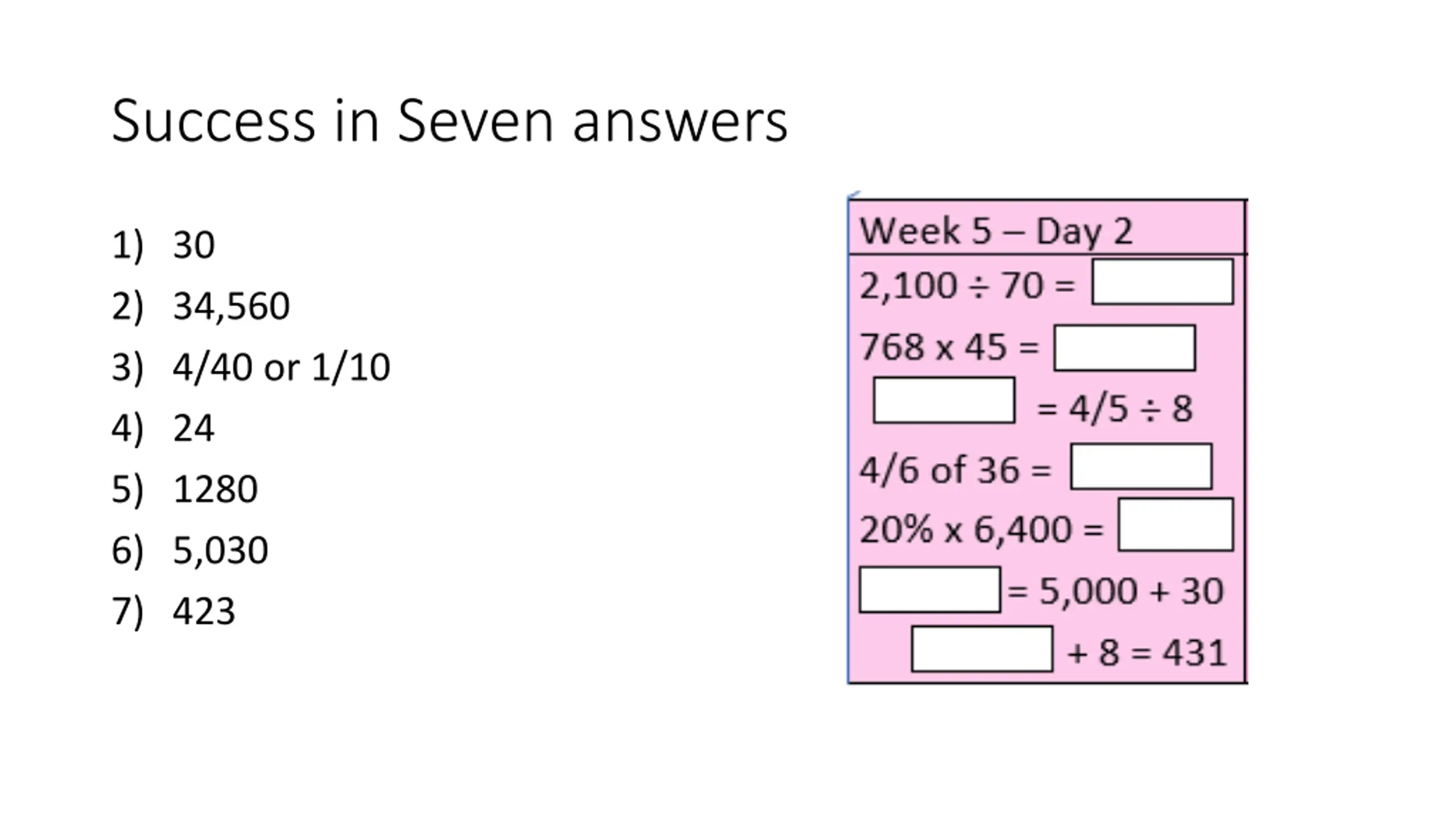 Success in Seven answers 1) 30 2) 34,560 3) 4/40 or 1/10 4) 24 5) 1280 6) 5,030 7) 423