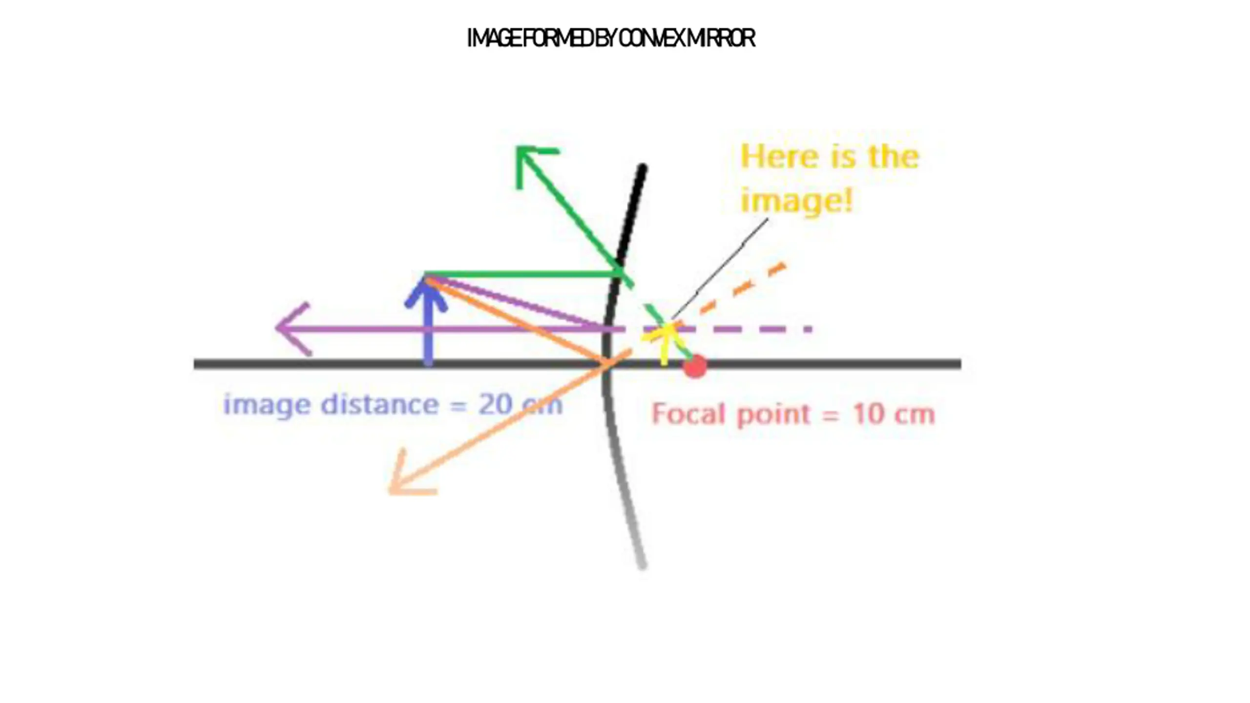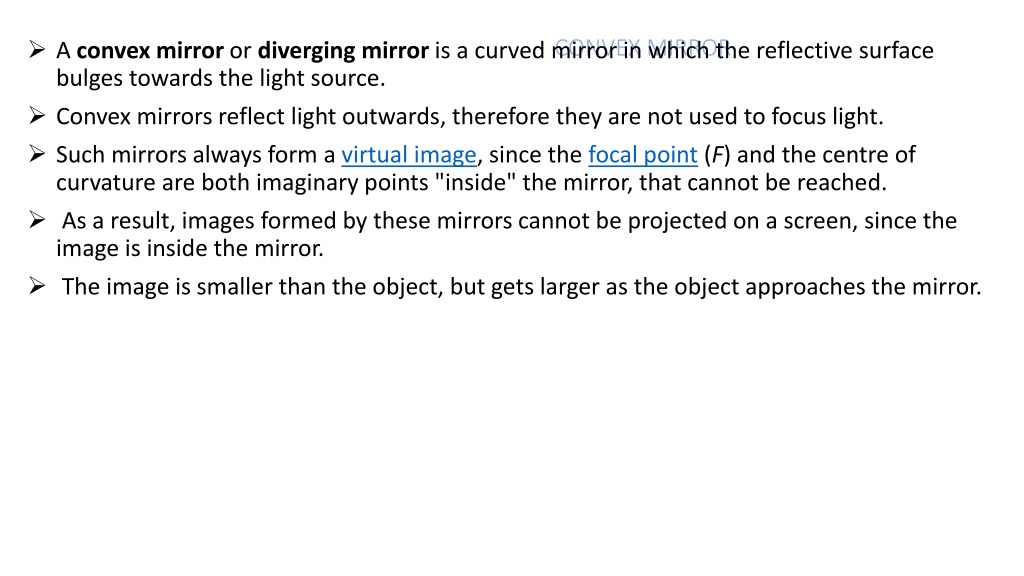 A convex mirror or diverging mirror is a curved mirror in which the reflective surface bulges towards the light source. Convex mirrors reflect light outwards, therefore they are not used to focus light. Such mirrors always form a virtual image, since the focal point (F) and the centre of curvature are both imaginary points "inside" the mirror, that cannot be reached. As a result, images formed by these mirrors cannot be projected on a screen, since the image is inside the mirror. The image is smaller than the object, but gets larger as the object approaches the mirror. CONVEX MIRROR
