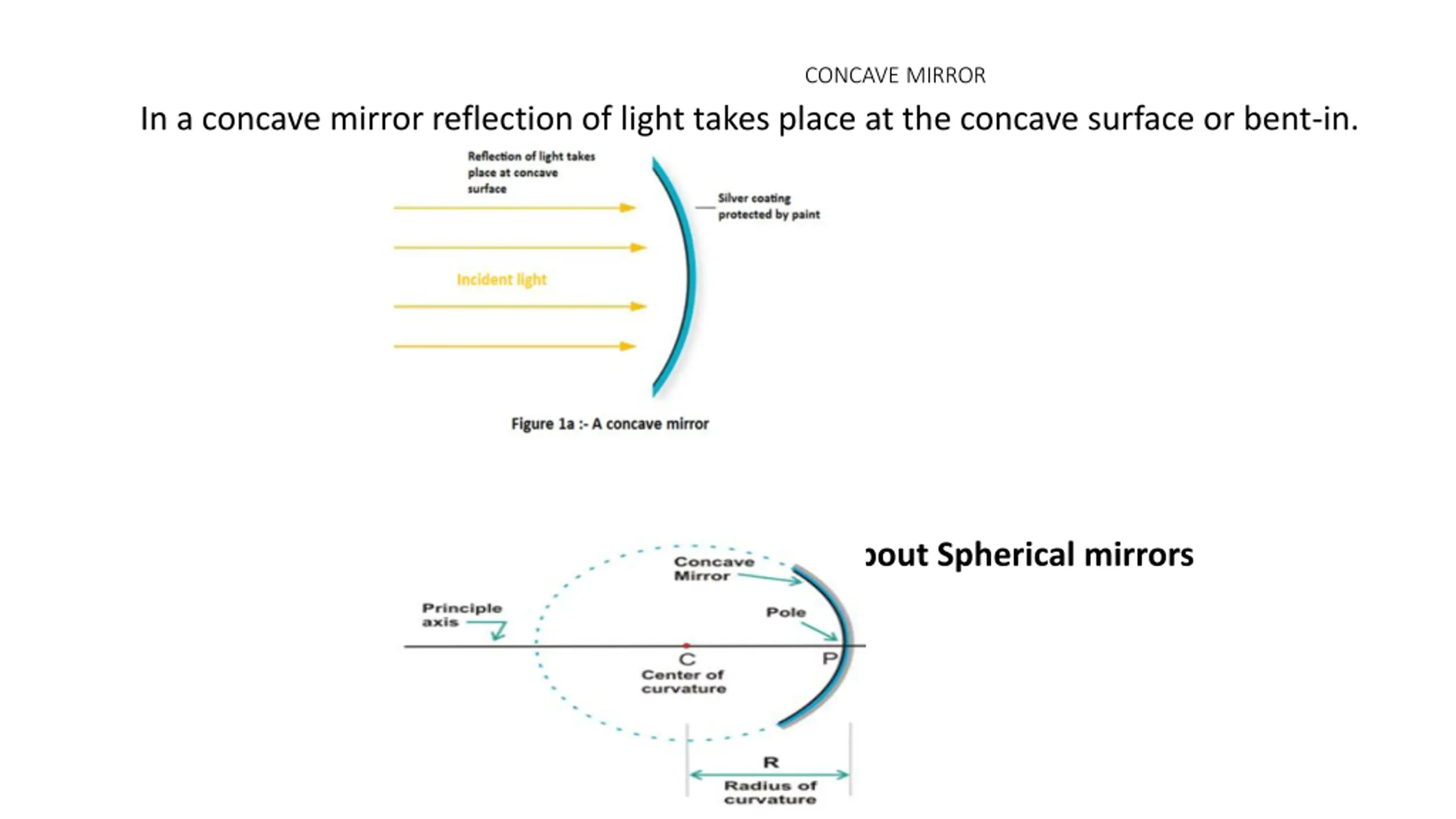 CONCAVE MIRROR In a concave mirror reflection of light takes place at the concave surface or bent-in. Commonly used terms about Spherical mirrors