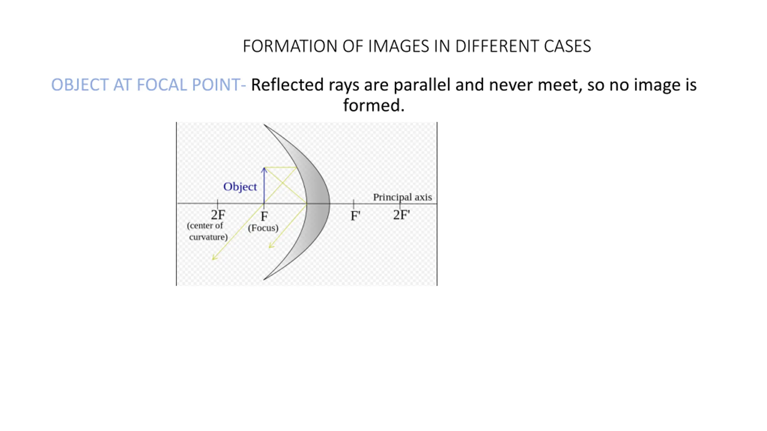 FORMATION OF IMAGES IN DIFFERENT CASES OBJECT AT FOCAL POINT- Reflected rays are parallel and never meet, so no image is formed.