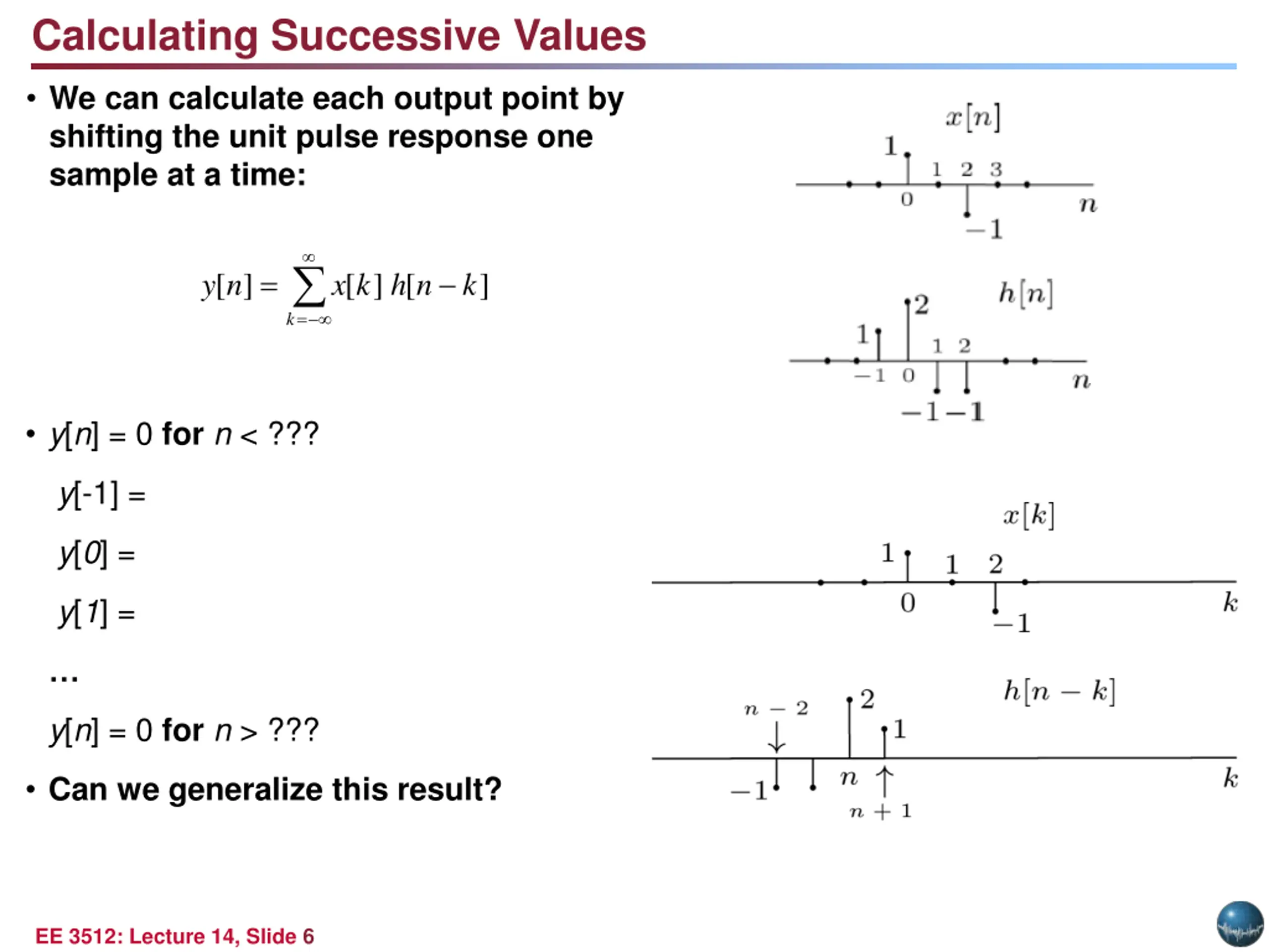 Calculating Successive Values We can calculate each output point by shifting the unit pulse response one sample at a time: = [ ] [ ] [ ] y n x k h n k = k y[n] = 0 for n < ??? y[-1] = y[0] = y[1] = y[n] = 0 for n > ??? Can we generalize this result? EE 3512: Lecture 14, Slide 6
