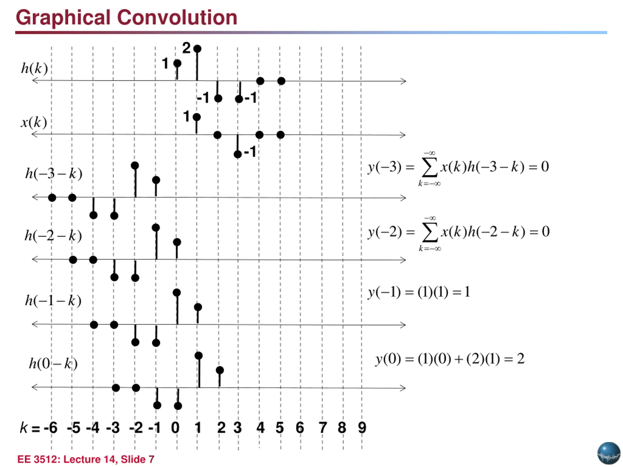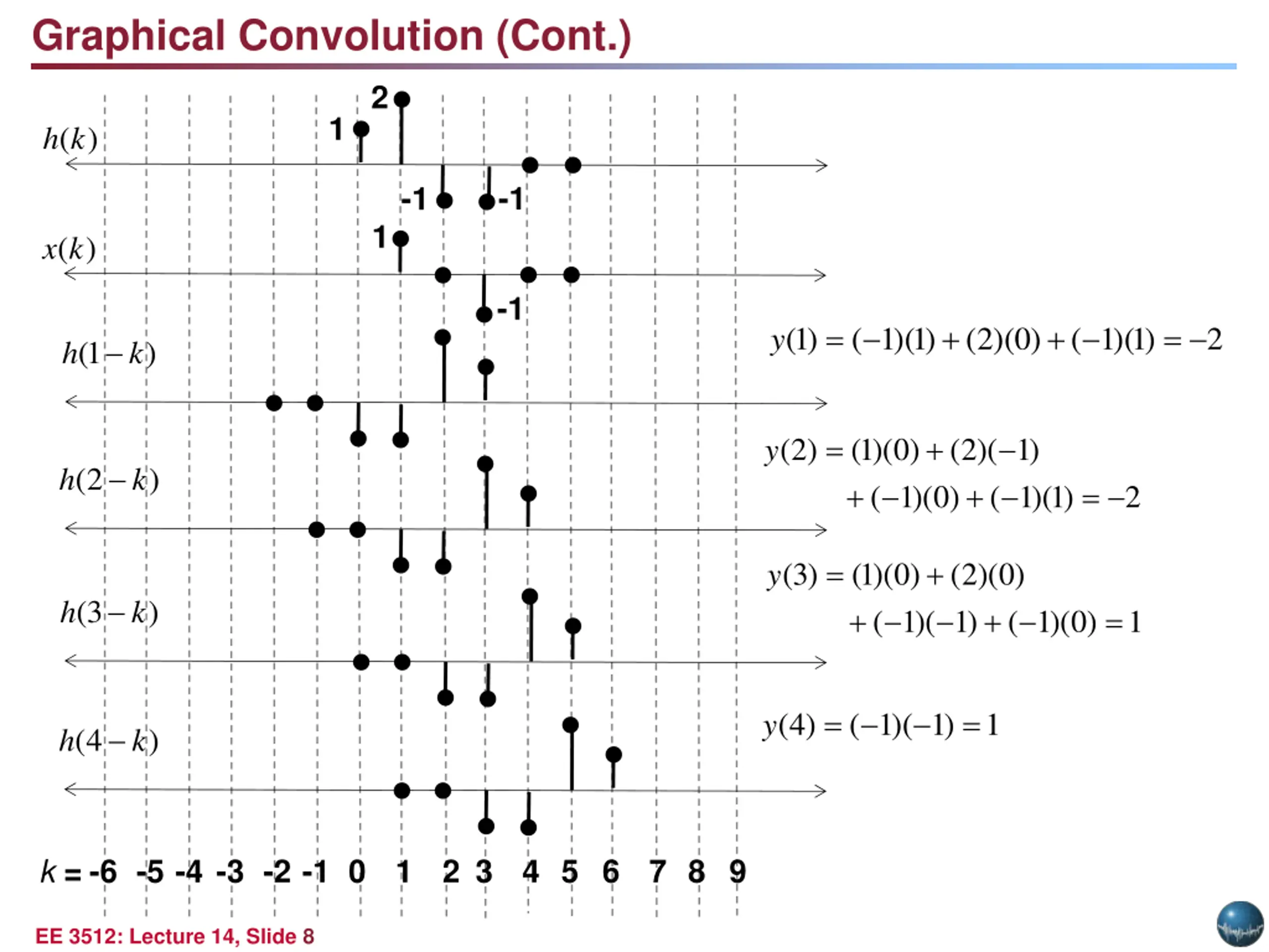 Graphical Convolution 2 1 (k ) h -1 -1 1 (k ) x -1 = k ) 3 = = ( ( ) ( 3 ) 0 y x k h k ( 3 ) h k = k ) 2 = = ( ( ) ( 2 ) 0 y x k h k ( 2 ) h k ) 1 = = ( 1 ( ) 1 )( 1 y ( 1 ) h k = + = ) 0 ( y 1 ( ) 0 )( 2 ( ) 1 )( 2 0 ( h ) k k = -6 -5 -4 -3 -2 -1 0 1 2 3 4 5 6 7 8 9 EE 3512: Lecture 14, Slide 7