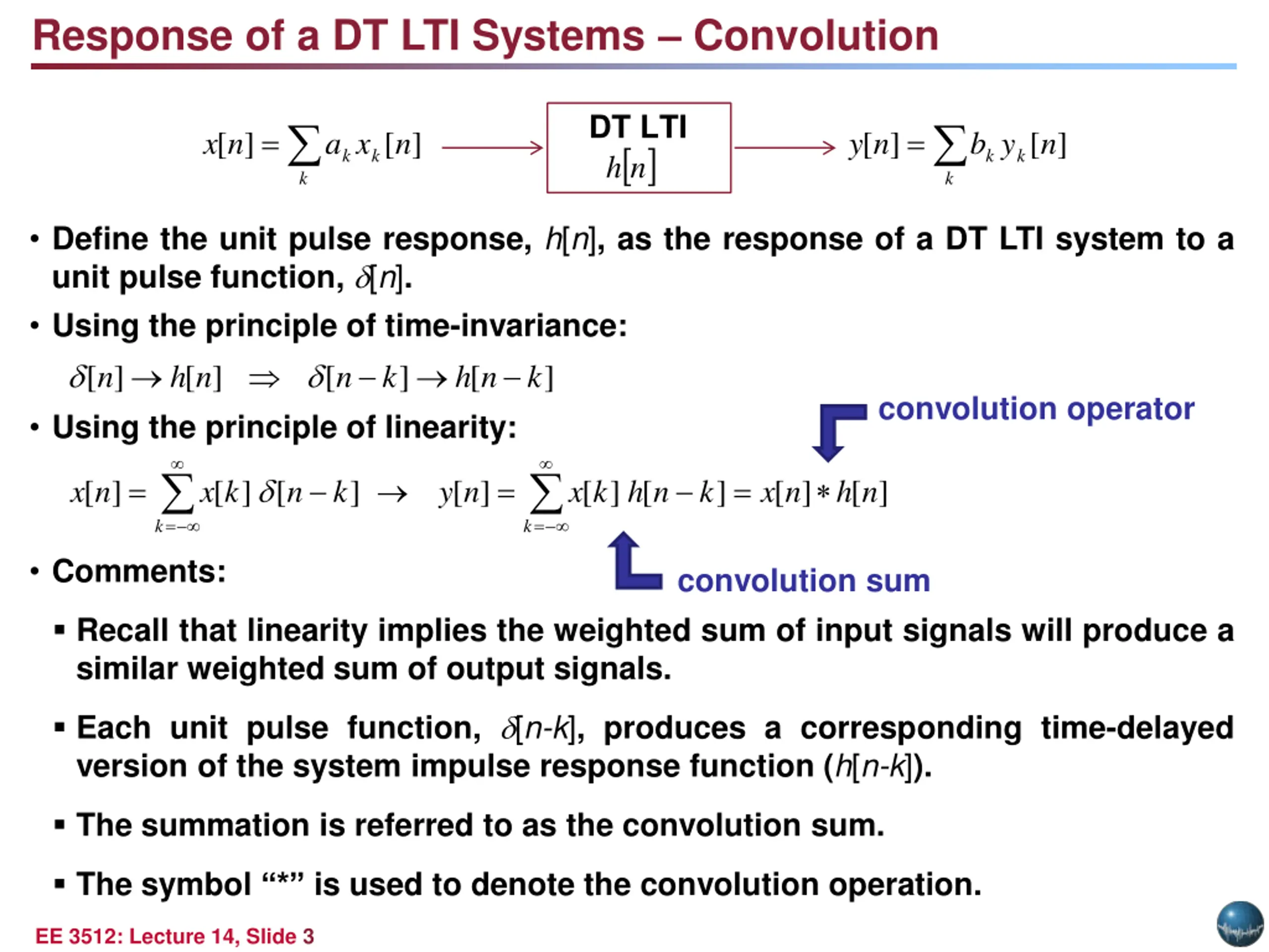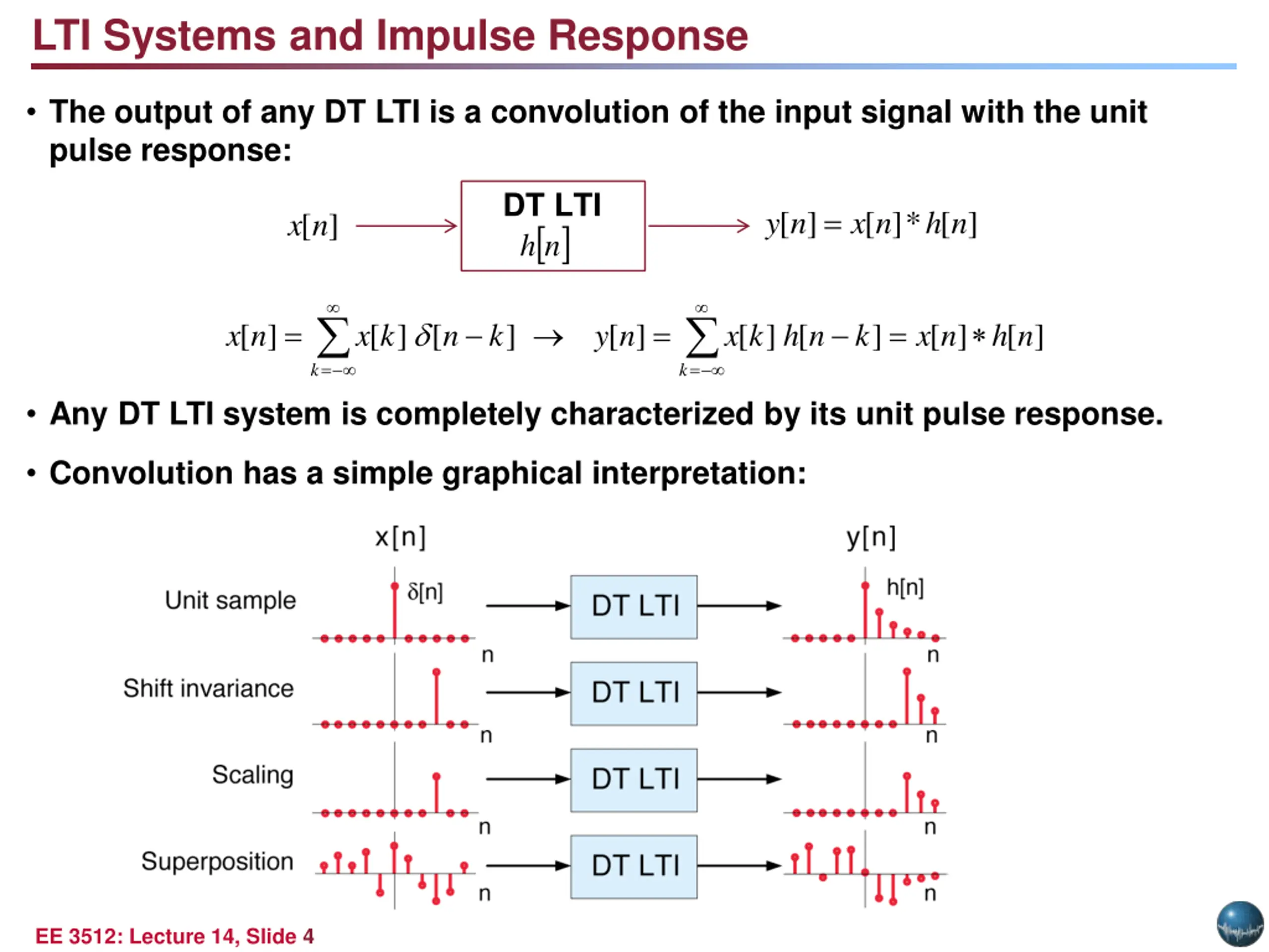 LTI Systems and Impulse Response The output of any DT LTI is a convolution of the input signal with the unit pulse response: DT LTI n h = [ ] [ ] * [ ] y n x n h n [n x ] = = = = = [ ] [ ] [ ] [ ] [ ] [ ] [ ] [ ] x n x k n k y n x k h n k x n h n k k Any DT LTI system is completely characterized by its unit pulse response. Convolution has a simple graphical interpretation: EE 3512: Lecture 14, Slide 4