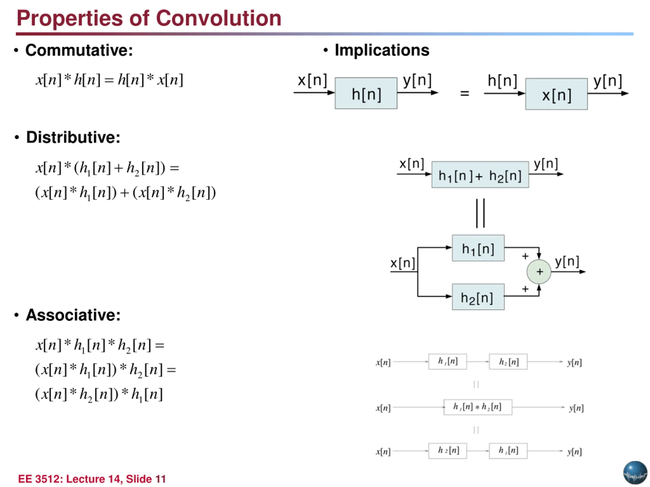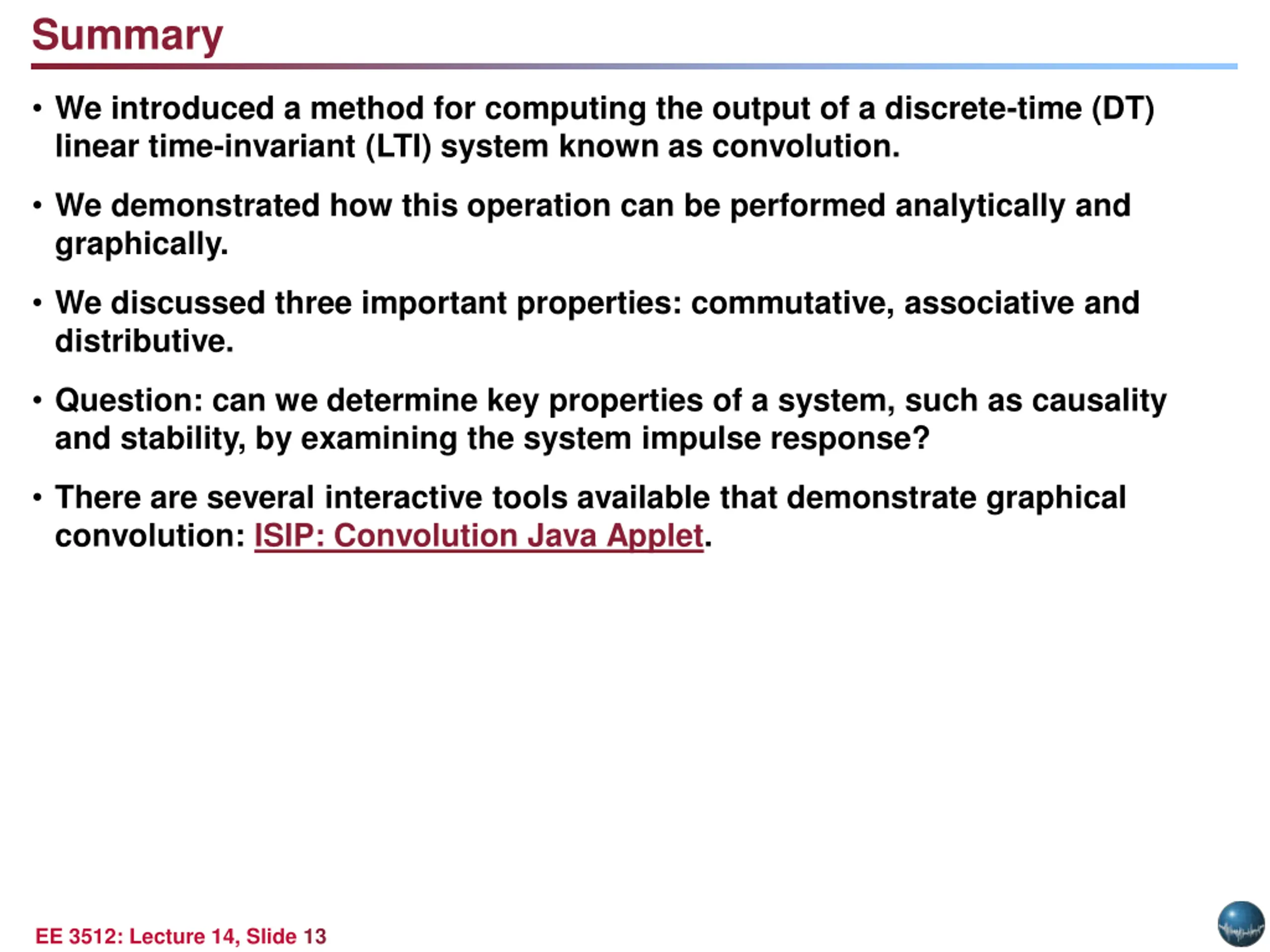 Summary We introduced a method for computing the output of a discrete-time (DT) linear time-invariant (LTI) system known as convolution. We demonstrated how this operation can be performed analytically and graphically. We discussed three important properties: commutative, associative and distributive. Question: can we determine key properties of a system, such as causality and stability, by examining the system impulse response? There are several interactive tools available that demonstrate graphical convolution: ISIP: Convolution Java Applet. EE 3512: Lecture 14, Slide 13