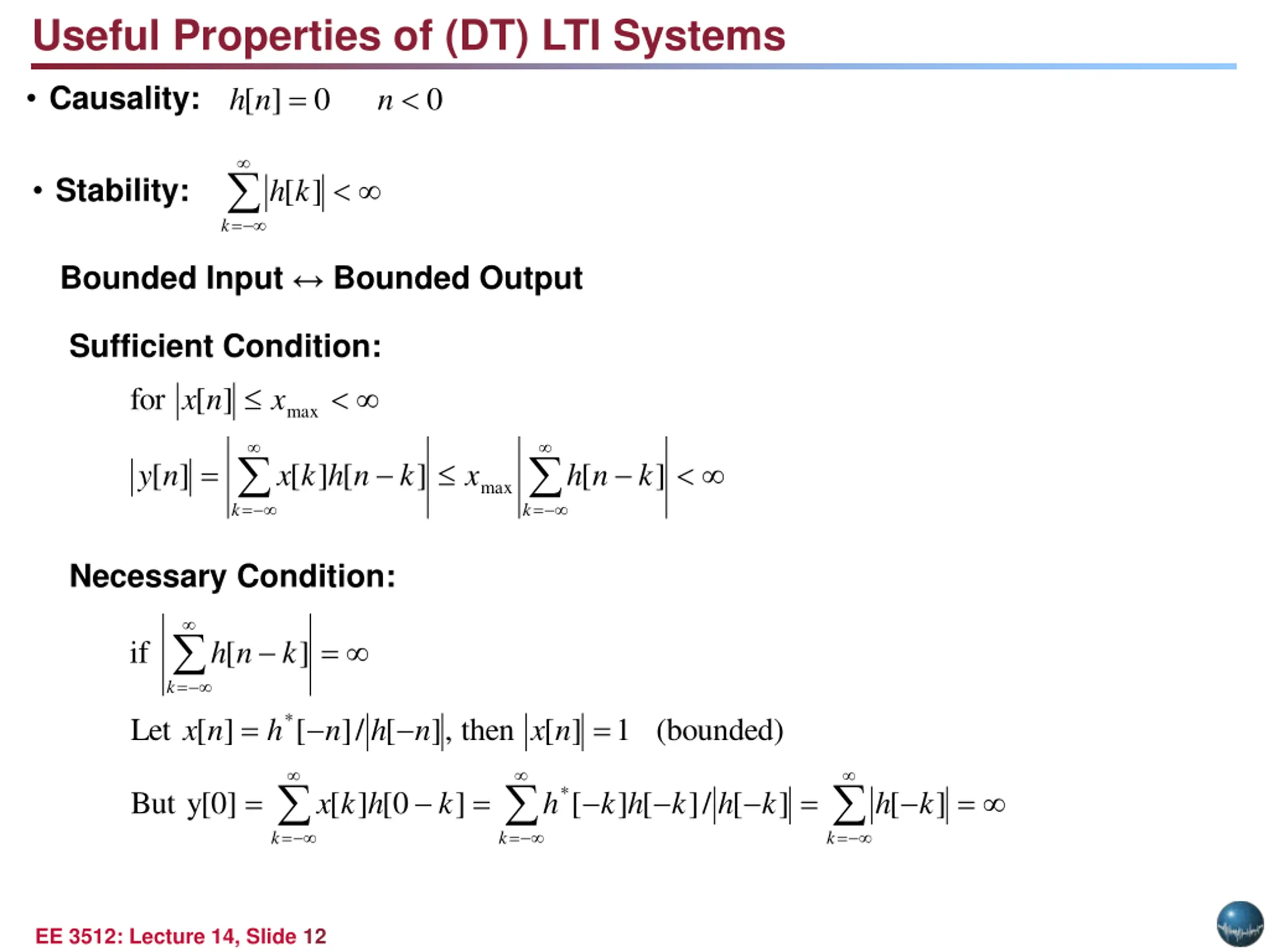 Useful Properties of (DT) LTI Systems = Causality: [ ] 0 0 h n n = k Stability: h ] [ k Bounded Input Bounded Output Sufficient Condition: for [ ] x n x max = k = k = [ ] [ ] [ ] [ ] y n x k h n k x h n k max Necessary Condition: = k x = if [ ] h n k = = * Let [ ] [ / ] [ , ] then [ ] 1 (bounded) n h n h n x n = k = k = k = = = = * But y[0] [ ] 0 [ ] [ ] [ / ] [ ] [ ] x k h k h k h k h k h k EE 3512: Lecture 14, Slide 12
