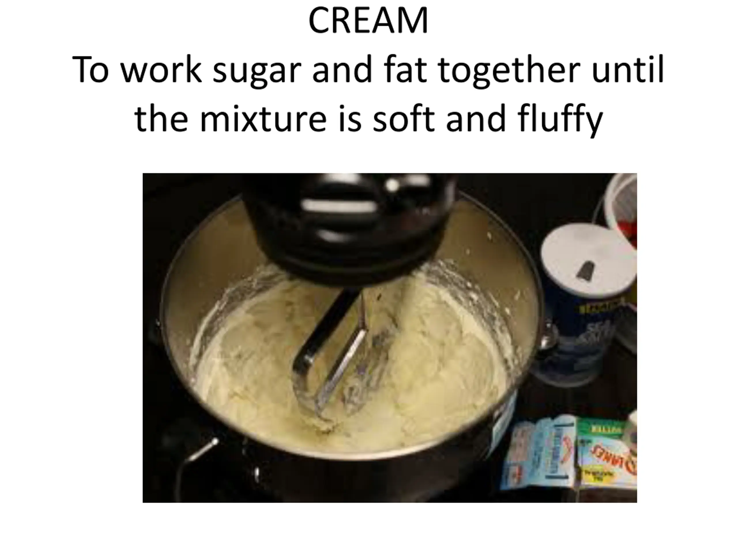 CREAM To work sugar and fat together until the mixture is soft and fluffy