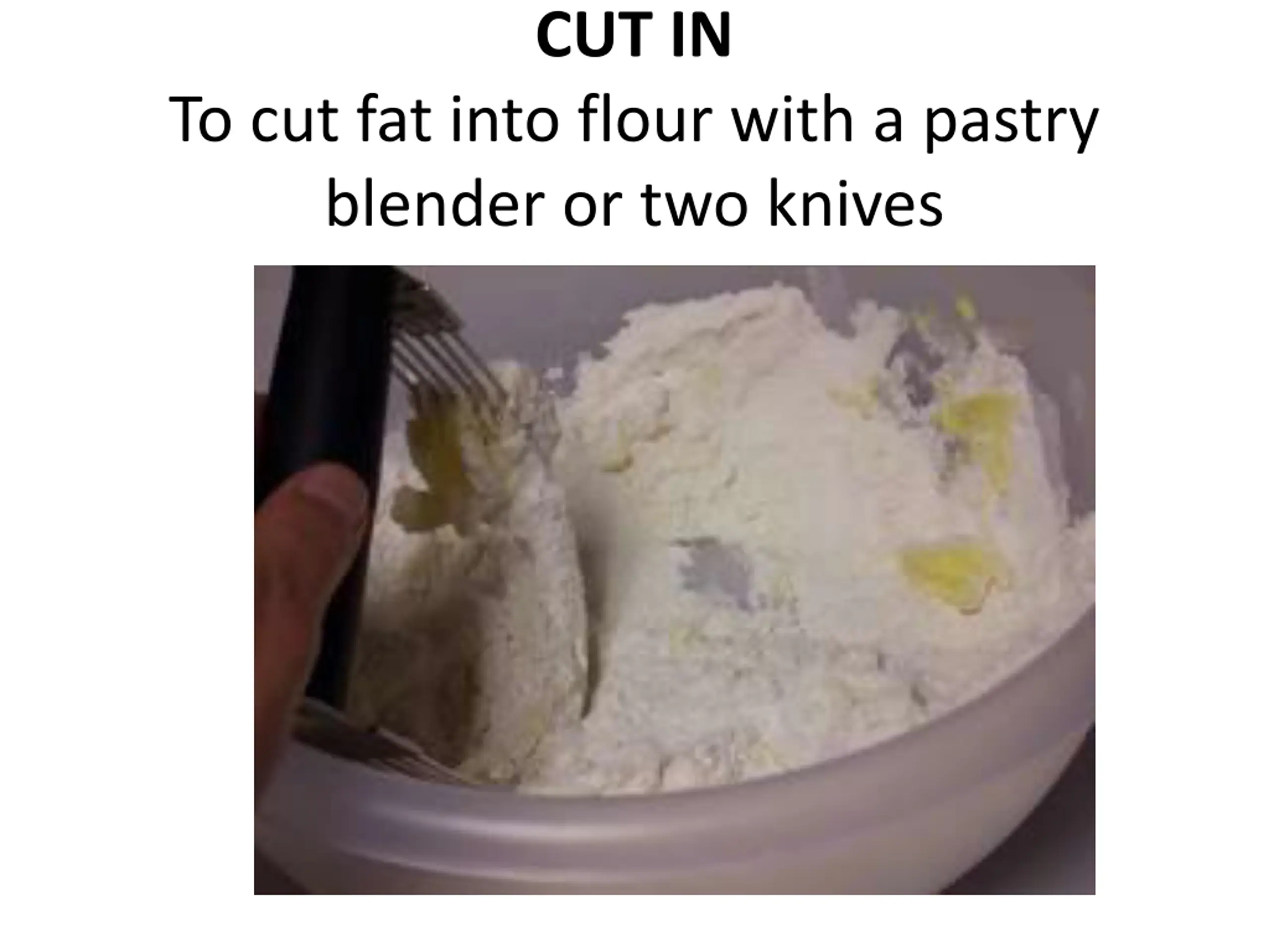 CUT IN To cut fat into flour with a pastry blender or two knives