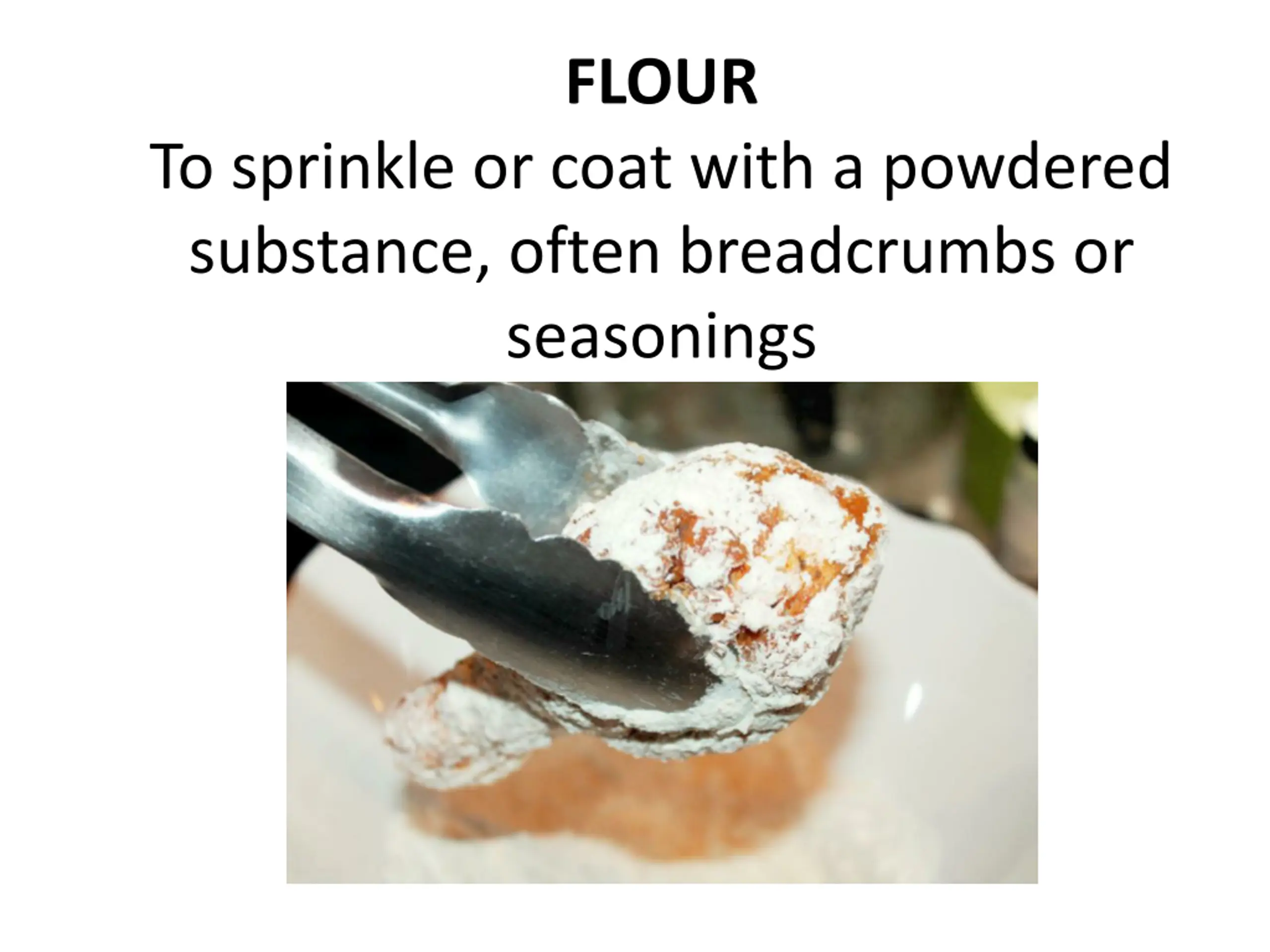 FLOUR To sprinkle or coat with a powdered substance, often breadcrumbs or seasonings