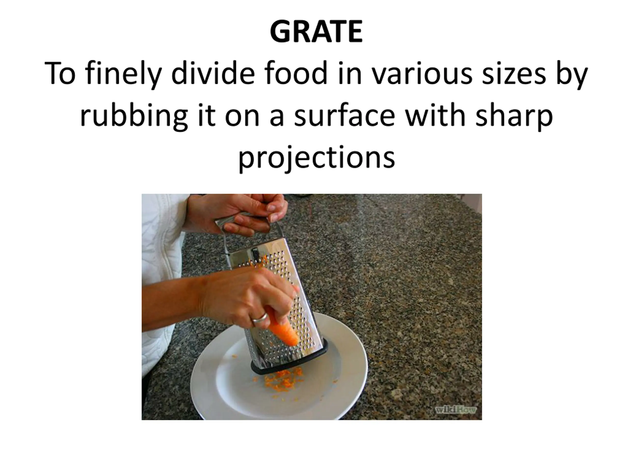 GRATE To finely divide food in various sizes by rubbing it on a surface with sharp projections