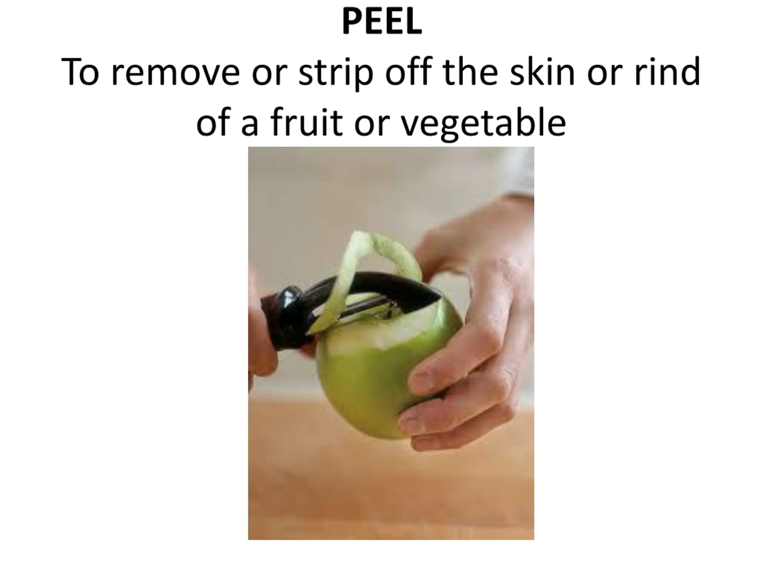 PEEL To remove or strip off the skin or rind of a fruit or vegetable