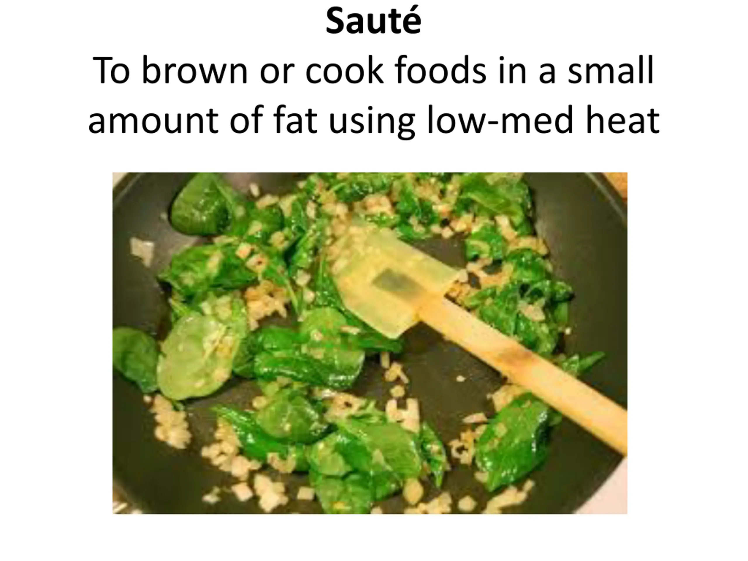 Saut To brown or cook foods in a small amount of fat using low-med heat