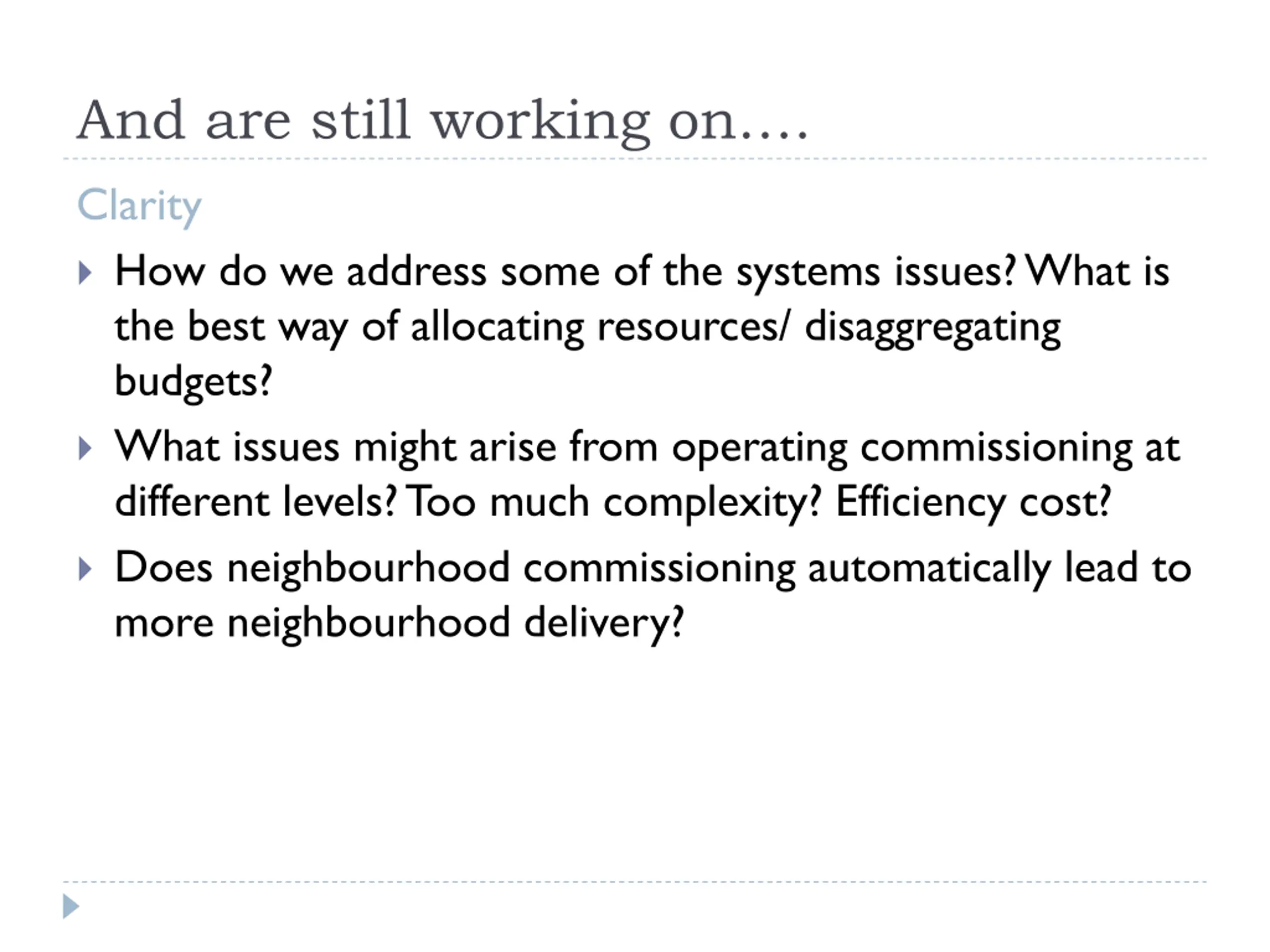 And are still working on. Clarity How do we address some of the systems issues? What is the best way of allocating resources/ disaggregating budgets? What issues might arise from operating commissioning at different levels? Too much complexity? Efficiency cost? Does neighbourhood commissioning automatically lead to more neighbourhood delivery?