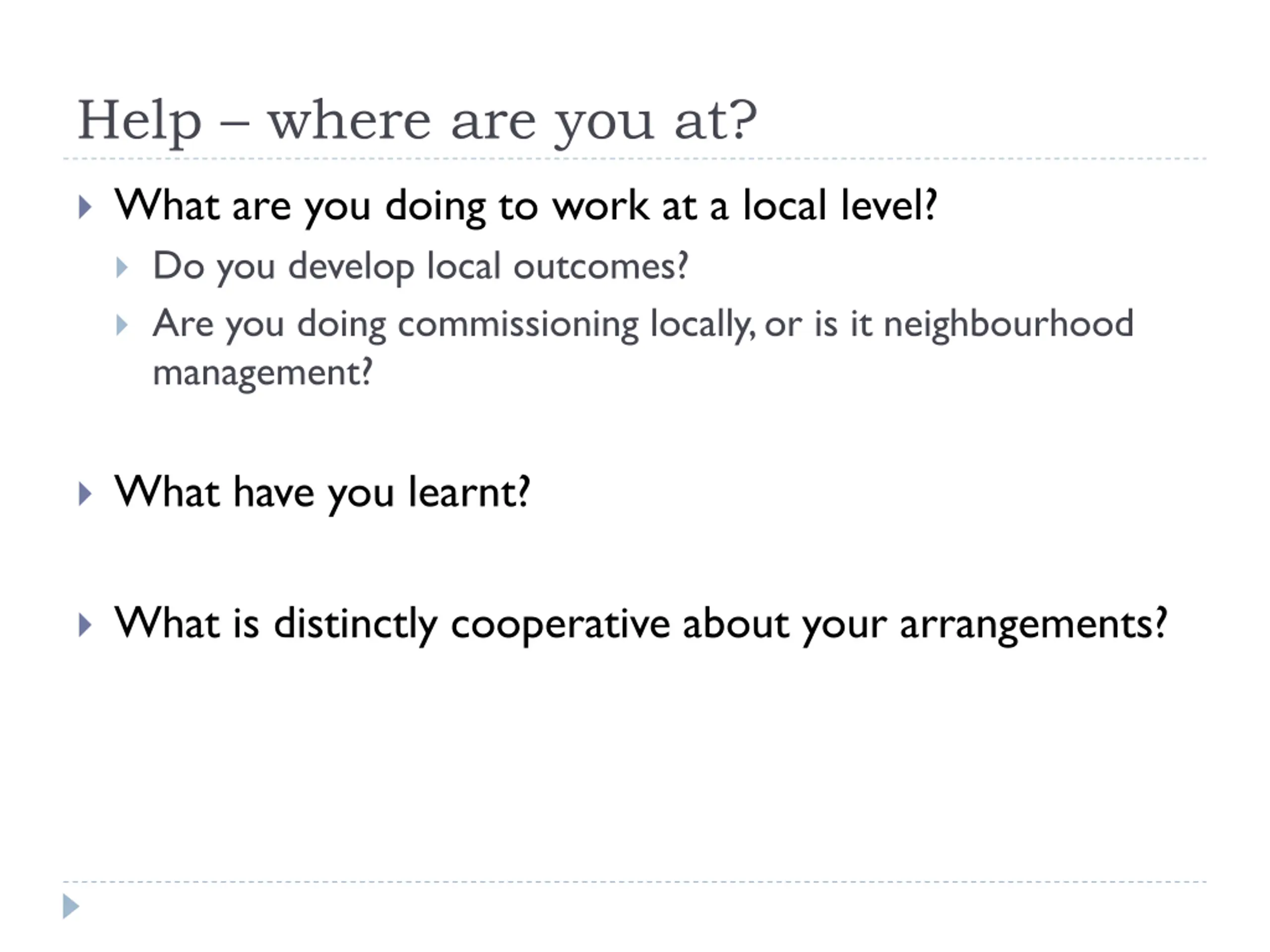 Help where are you at? What are you doing to work at a local level? Do you develop local outcomes? Are you doing commissioning locally, or is it neighbourhood management? What have you learnt? What is distinctly cooperative about your arrangements?