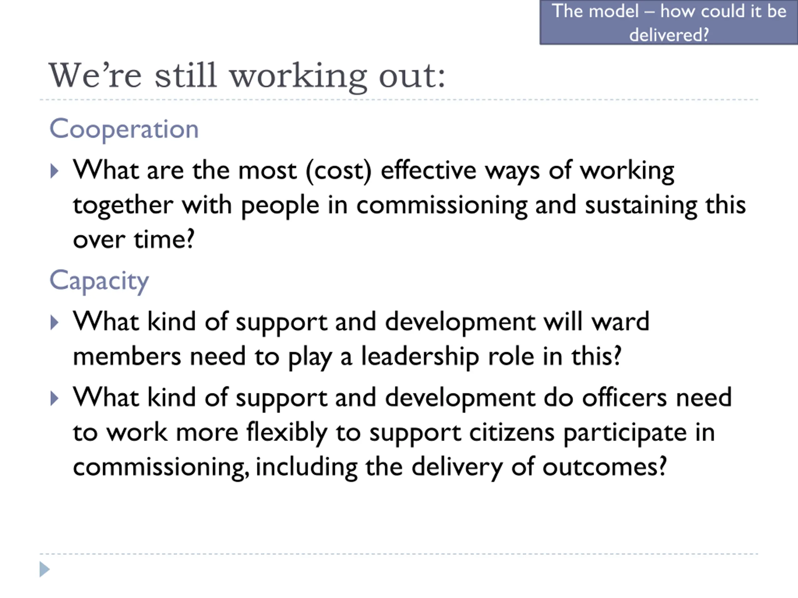 The model how could it be delivered? We re still working out: Cooperation What are the most (cost) effective ways of working together with people in commissioning and sustaining this over time? Capacity What kind of support and development will ward members need to play a leadership role in this? What kind of support and development do officers need to work more flexibly to support citizens participate in commissioning, including the delivery of outcomes?