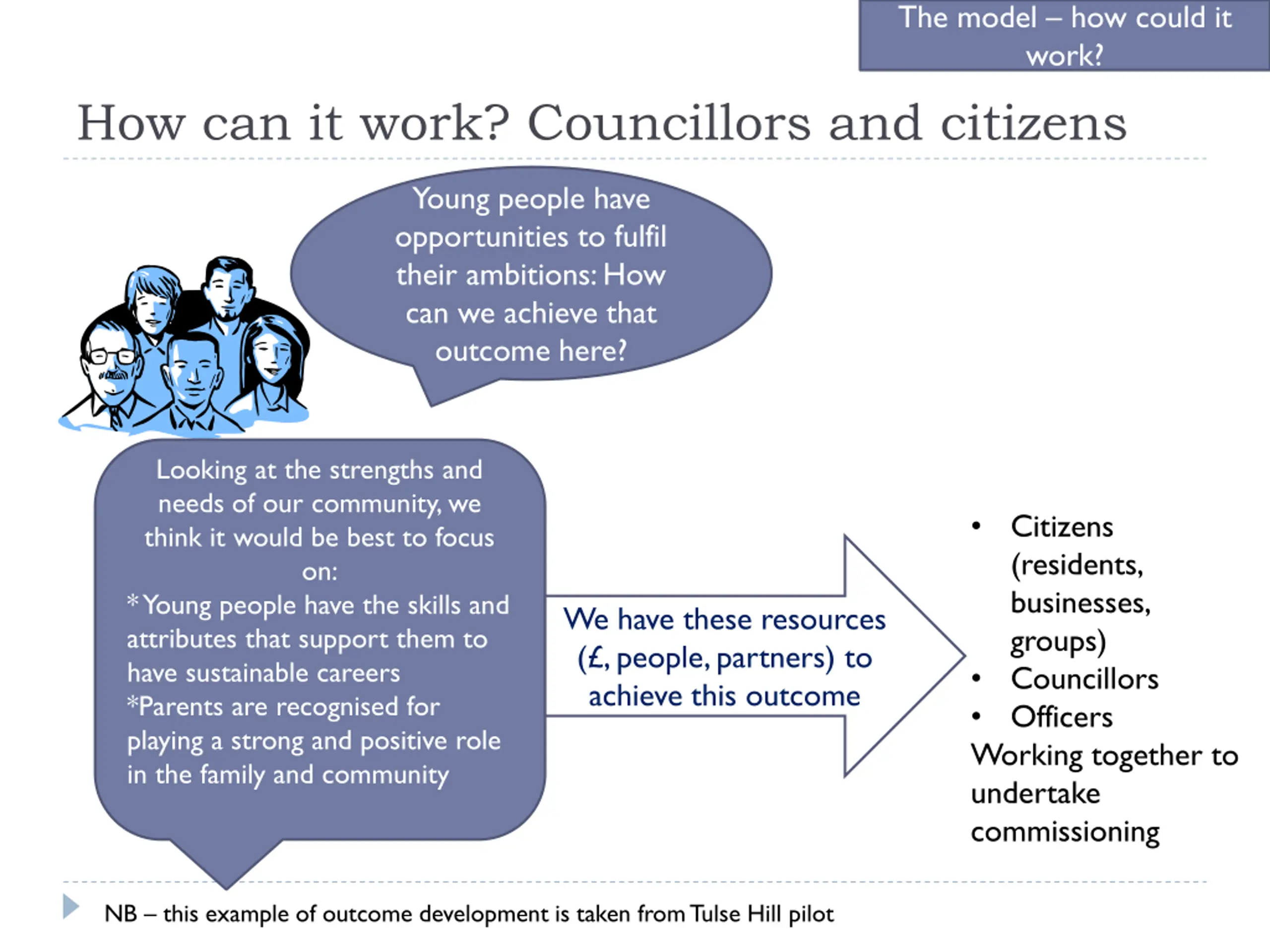 The model how could it work? How can it work? Councillors and citizens Young people have opportunities to fulfil their ambitions: How can we achieve that outcome here? Looking at the strengths and needs of our community, we think it would be best to focus on: * Young people have the skills and attributes that support them to have sustainable careers *Parents are recognised for playing a strong and positive role in the family and community Citizens (residents, businesses, groups) Councillors Officers Working together to undertake commissioning We have these resources ( , people, partners) to achieve this outcome NB this example of outcome development is taken from Tulse Hill pilot