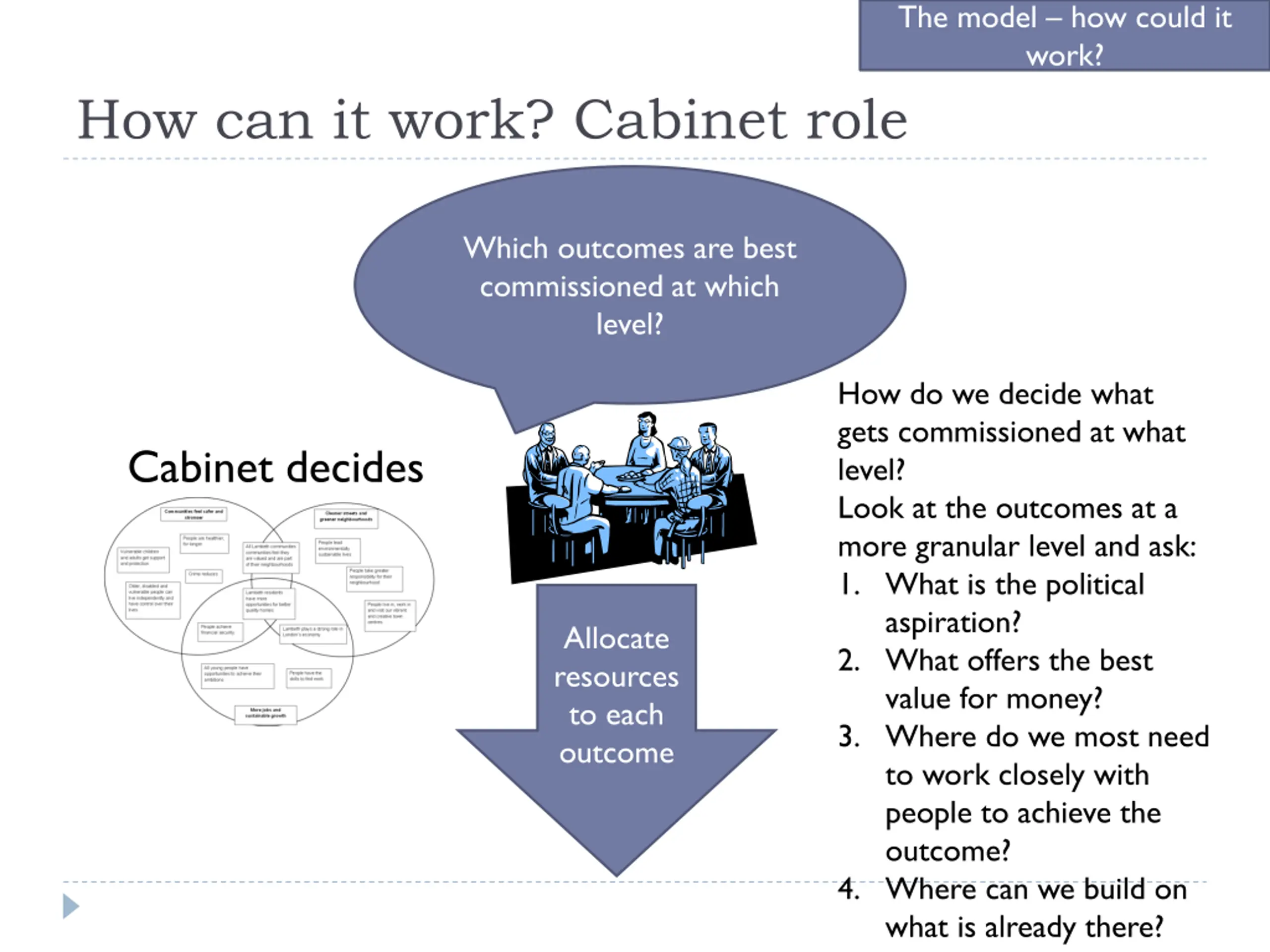 The model how could it work? How can it work? Cabinet role Which outcomes are best commissioned at which level? How do we decide what gets commissioned at what level? Look at the outcomes at a more granular level and ask: 1. What is the political aspiration? 2. What offers the best value for money? 3. Where do we most need to work closely with people to achieve the outcome? 4. Where can we build on what is already there? Cabinet decides Allocate resources to each outcome
