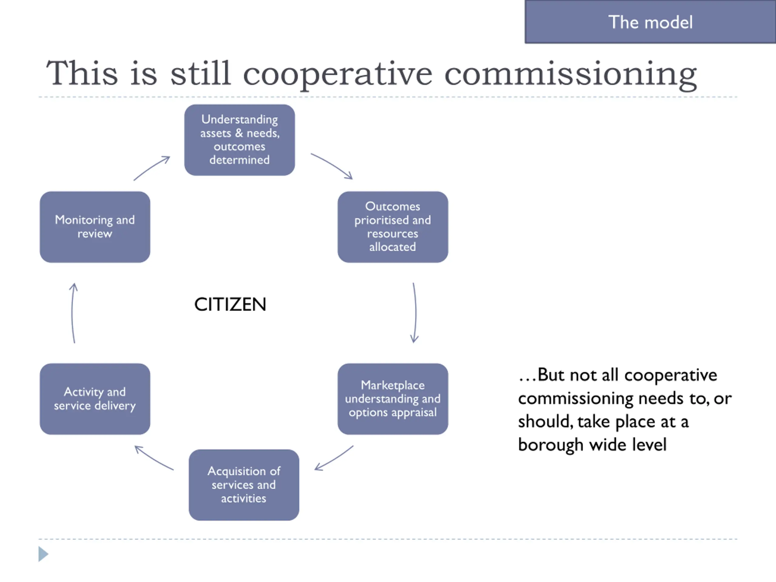 The model This is still cooperative commissioning Understanding assets & needs, outcomes determined Outcomes prioritised and resources allocated Monitoring and review CITIZEN But not all cooperative commissioning needs to, or should, take place at a borough wide level Marketplace understanding and options appraisal Activity and service delivery Acquisition of services and activities
