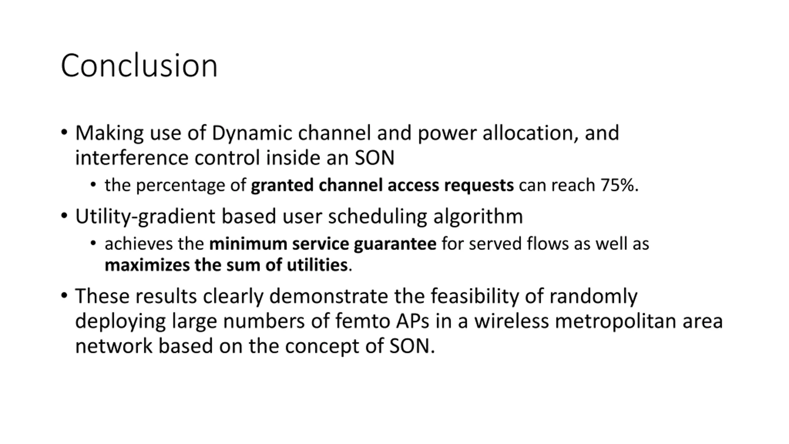 Conclusion Making use of Dynamic channel and power allocation, and interference control inside an SON the percentage of granted channel access requests can reach 75%. Utility-gradient based user scheduling algorithm achieves the minimum service guarantee for served flows as well as maximizes the sum of utilities. These results clearly demonstrate the feasibility of randomly deploying large numbers of femto APs in a wireless metropolitan area network based on the concept of SON.