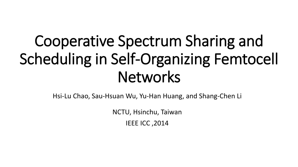 Cooperative Spectrum Sharing and Cooperative Spectrum Sharing and Scheduling in Self Scheduling in Self- -Organizing Organizing Femtocell Networks Networks Femtocell Hsi-Lu Chao, Sau-Hsuan Wu, Yu-Han Huang, and Shang-Chen Li NCTU, Hsinchu, Taiwan IEEE ICC ,2014