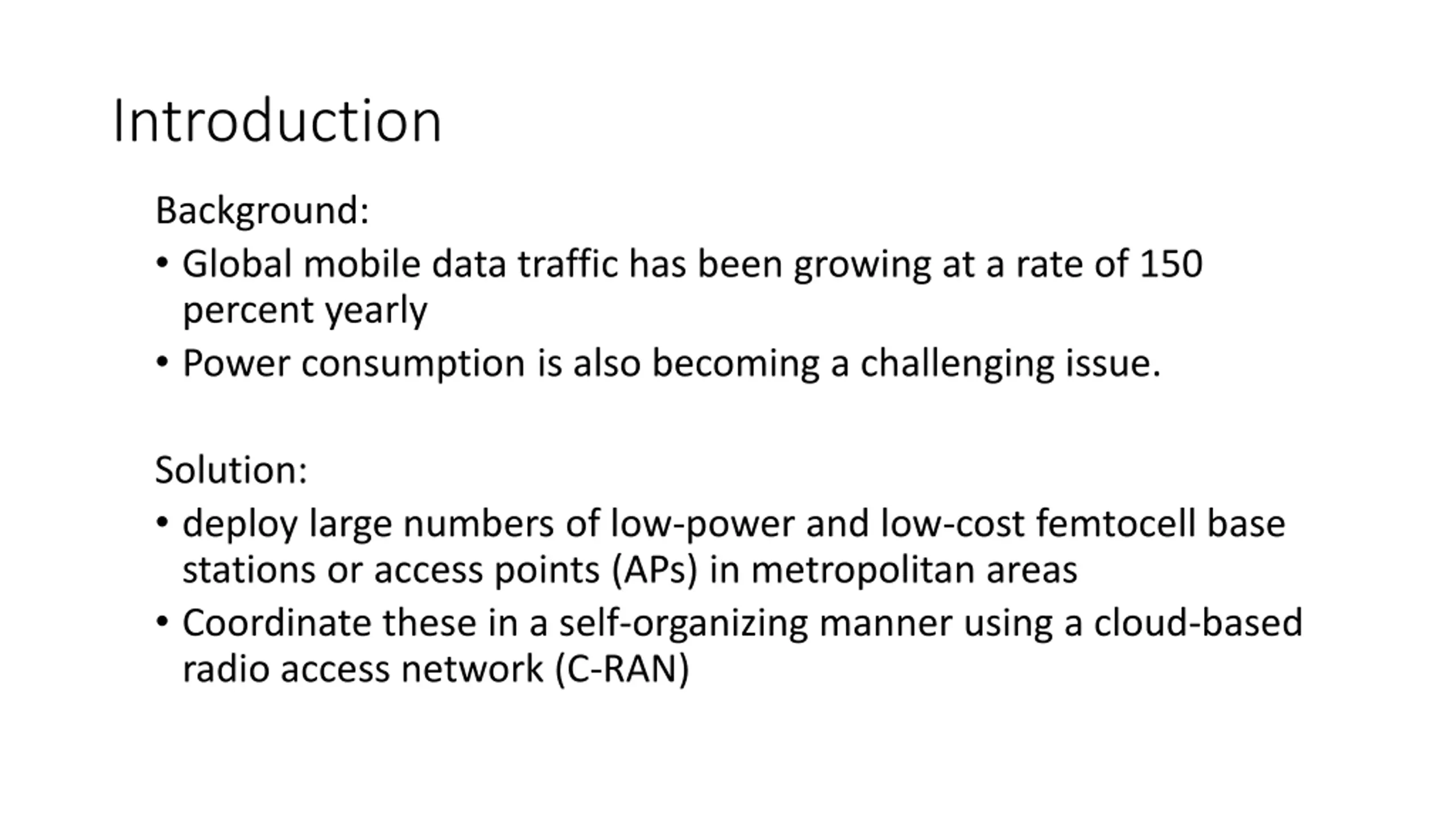 Introduction Background: Global mobile data traffic has been growing at a rate of 150 percent yearly Power consumption is also becoming a challenging issue. Solution: deploy large numbers of low-power and low-cost femtocell base stations or access points (APs) in metropolitan areas Coordinate these in a self-organizing manner using a cloud-based radio access network (C-RAN)
