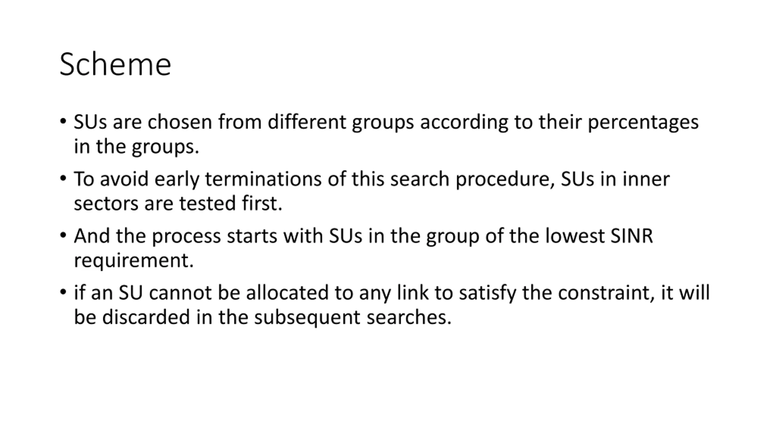 Scheme SUs are chosen from different groups according to their percentages in the groups. To avoid early terminations of this search procedure, SUs in inner sectors are tested first. And the process starts with SUs in the group of the lowest SINR requirement. if an SU cannot be allocated to any link to satisfy the constraint, it will be discarded in the subsequent searches.