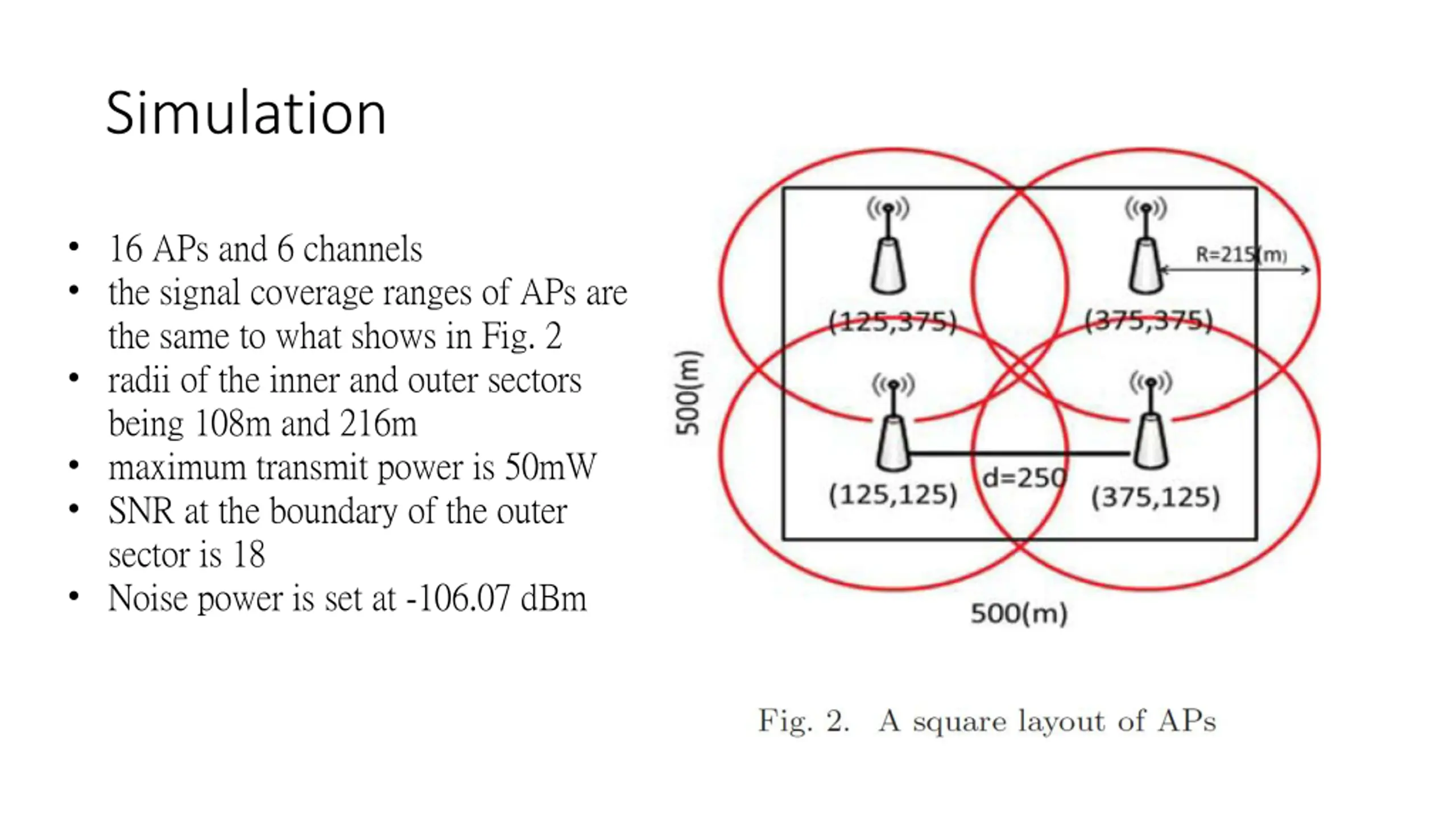 Simulation 16 APs and 6 channels the signal coverage ranges of APs are the same to what shows in Fig. 2 radii of the inner and outer sectors being 108m and 216m maximum transmit power is 50mW SNR at the boundary of the outer sector is 18 Noise power is set at -106.07 dBm