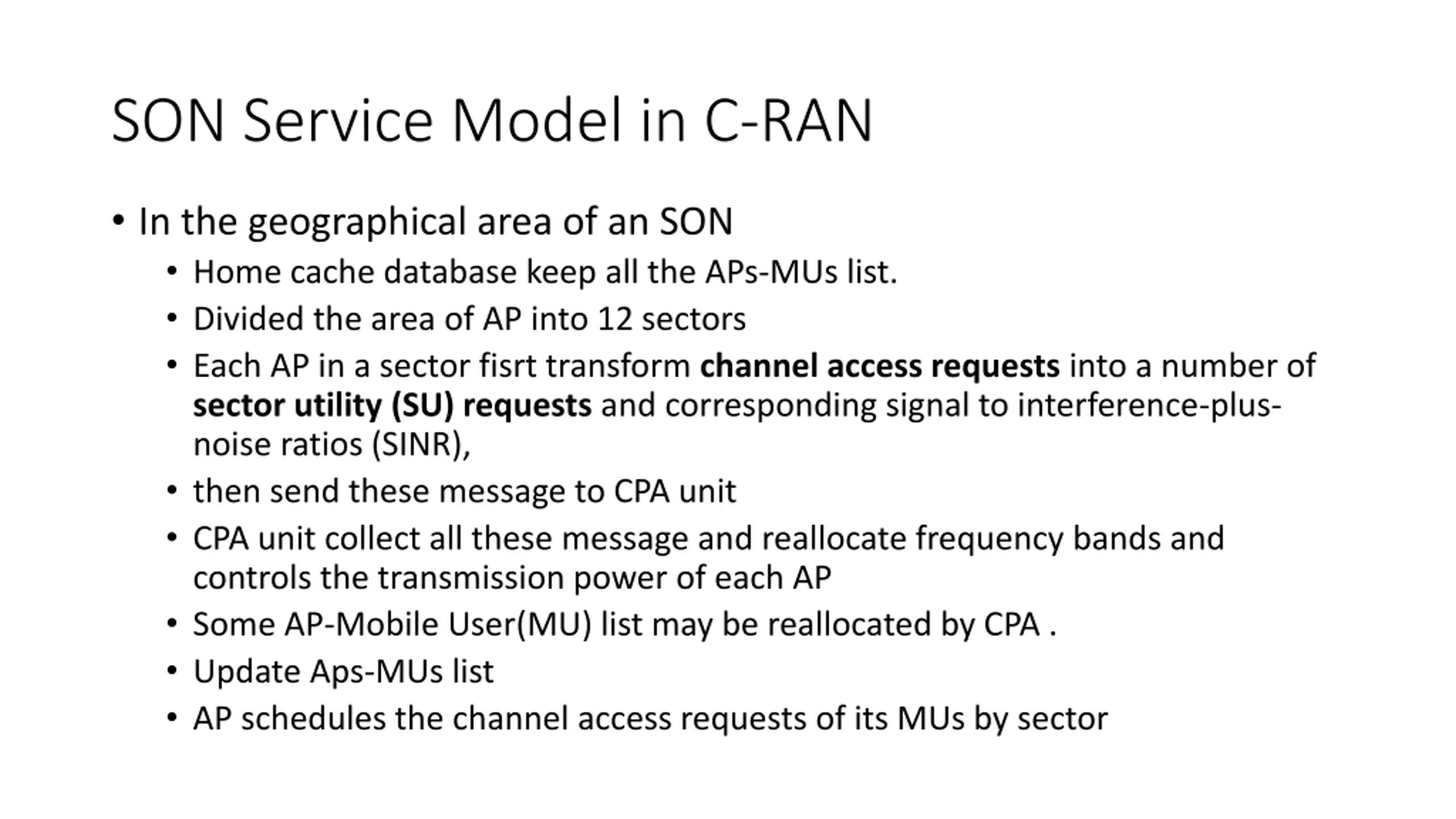 SON Service Model in C-RAN In the geographical area of an SON Home cache database keep all the APs-MUs list. Divided the area of AP into 12 sectors Each AP in a sector fisrt transform channel access requests into a number of sector utility (SU) requests and corresponding signal to interference-plus- noise ratios (SINR), then send these message to CPA unit CPA unit collect all these message and reallocate frequency bands and controls the transmission power of each AP Some AP-Mobile User(MU) list may be reallocated by CPA . Update Aps-MUs list AP schedules the channel access requests of its MUs by sector